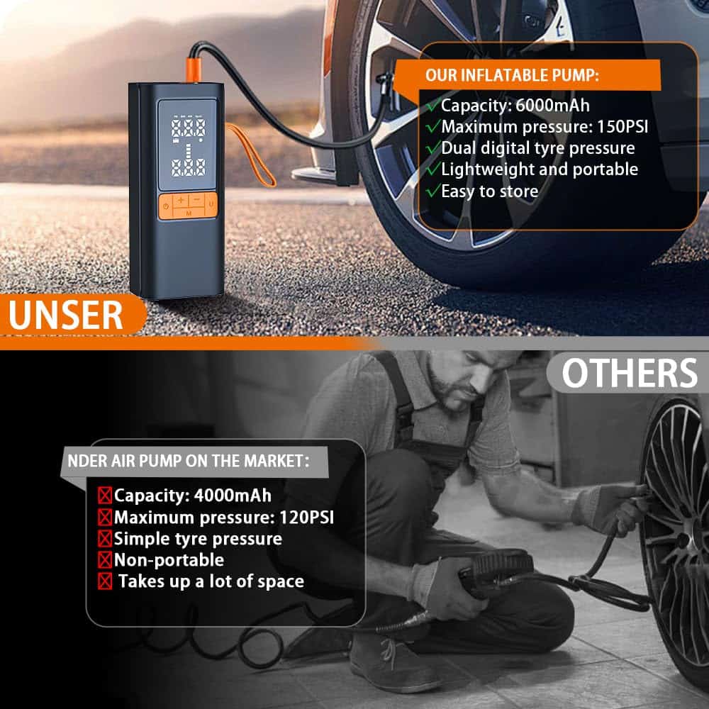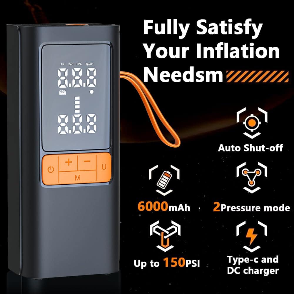 2. Inflado 2X más rápido y compacto: La presión máxima de 150 PSI del compresor, junto con su flujo de aire de 17L/min, ofrece un inflado 2X más rápido. Puede rellenar un neumático de 195/65R15 de 30 a 36 PSI en 1,5 minutos, asegurando que pases menos tiempo esperando y más tiempo conduciendo, para que puedas volver a la carretera en poco tiempo.