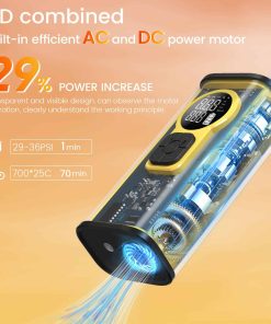 1. Inflación rápida y eficiente: el inflador de neumáticos portátil vogma Compresor de aire incorporado de alta eficiencia AC&DC motor de alta potencia de 19 cilindros, el diseño transparente y visible le permite observar el funcionamiento del motor, obteniendo una comprensión clara de sus principios de trabajo. Infla el doble de rápido que los infladores de neumáticos regulares. Los neumáticos R15 solo tardan 1 minuto de 29 a 36 PSI. La bicicleta de carretera 700 25C tarda 70s.