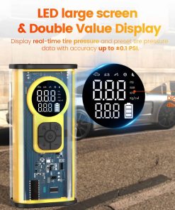 3. Pantallas LED duales precisas: nuestro compresor de aire portátil está equipado con pantallas LED digitales duales, la pantalla es grande y fácil de leer, la pantalla es clara a la luz del día, muestra la presión de los neumáticos en tiempo real y los datos de presión de los neumáticos preestablecidos, precisos a 0,1 PSI. El inflador de neumáticos inalámbrico vogma puede preajustar y monitorear la presión de los neumáticos, y se apaga automáticamente cuando se alcanza la presión establecida. No es necesario preocuparse por los neumáticos con demasiada inflación.