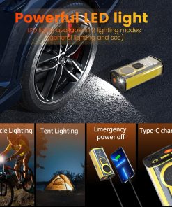 5. Compresor de aire multifuncional: además de servir como un compresor de aire portátil, también es una herramienta de emergencia multifuncional. Tiene una luz LED en la parte superior que proporciona 2 modos de iluminación (SOS, siempre encendido), que se puede usar para inflar aire en la oscuridad, cambiar neumáticos o advertir a otros vehículos de noche. La parte superior también incluye un puerto de carga tipo C y un puerto de salida USB de 5V/2A, lo que le permite servir como una fuente de energía de emergencia para dispositivos electrónicos.