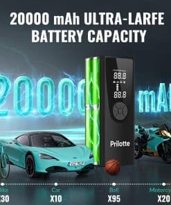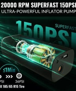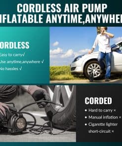 2. Compresor de aire portátil – Bomba de aire inalámbrica potente de 16V con un chip de alto rendimiento incorporado que infla los neumáticos rápidamente. Proporciona 34 L/min de flujo de aire. Infla neumáticos de coche pequeños (27-36PSI) en menos de 1 minuto. Por favor, lea nuestro manual de usuario cuidadosamente antes de usarlo.