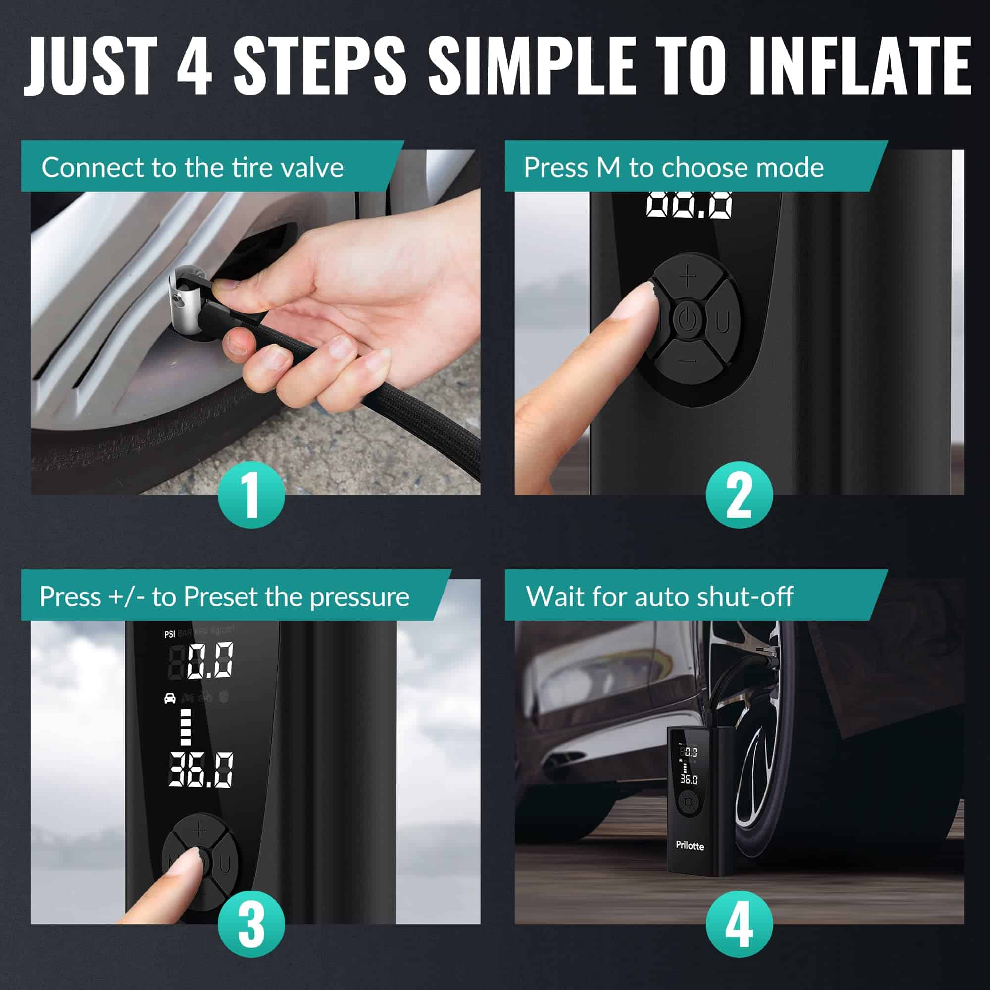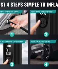 3. Inflador de neumáticos – 4 modos preestablecidos para inflar coches, motocicletas, bicicletas y pelotas, y se detiene automáticamente cuando alcanza el valor preestablecido, lo que facilita su uso para principiantes. El modo manual le permite establecer el valor de presión de acuerdo al objeto a inflar, MÁX 150PSI. Fácil de operar, puede cumplir con una variedad de necesidades de inflado.
