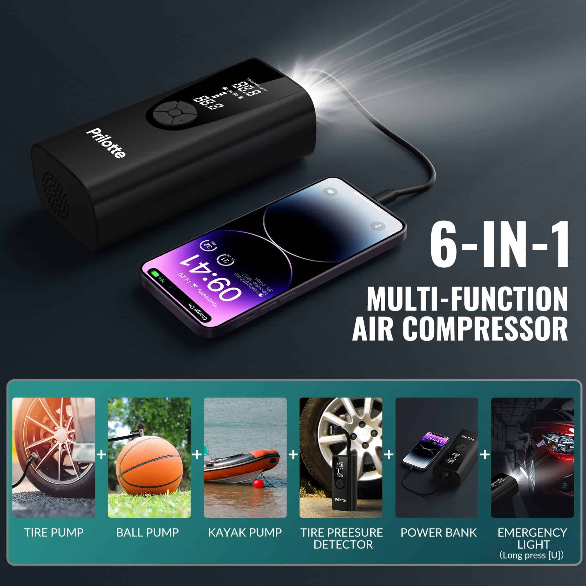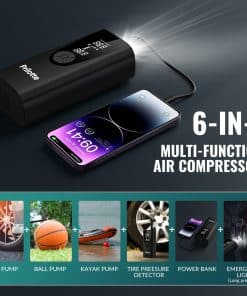 5. Inflador de neumáticos Compresor de aire portátil – La bomba de aire tiene una luz LED en la parte superior para convertirla en una fuente de energía de emergencia en la oscuridad, un puerto de entrada USB-C y un puerto de salida USB-A en la parte superior para invertir la fuente de alimentación y utilizarla como un banco de energía para su teléfono móvil. El producto es ligero y portátil y viene con una bolsa de almacenamiento para un fácil guardado.