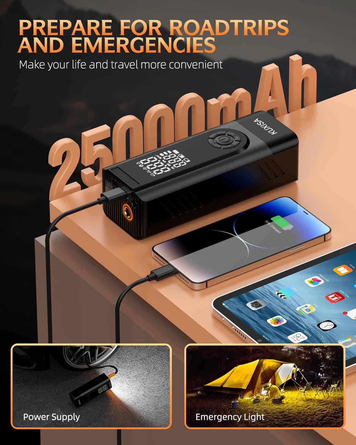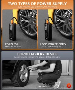 1. Energía persistente Este compresor de aire tiene una batería incorporada de 25000mAh y no requiere una fuente de alimentación externa al usarlo. La velocidad de inflado es tres veces más rápida que otros infladores inalámbricos ordinarios en el mercado, con un aumento del 35% en la potencia. Al mismo tiempo, también puedes conectarlo al puerto del encendedor de cigarrillos del coche para cargar la bomba infladora, evitando que la bomba se quede sin batería.