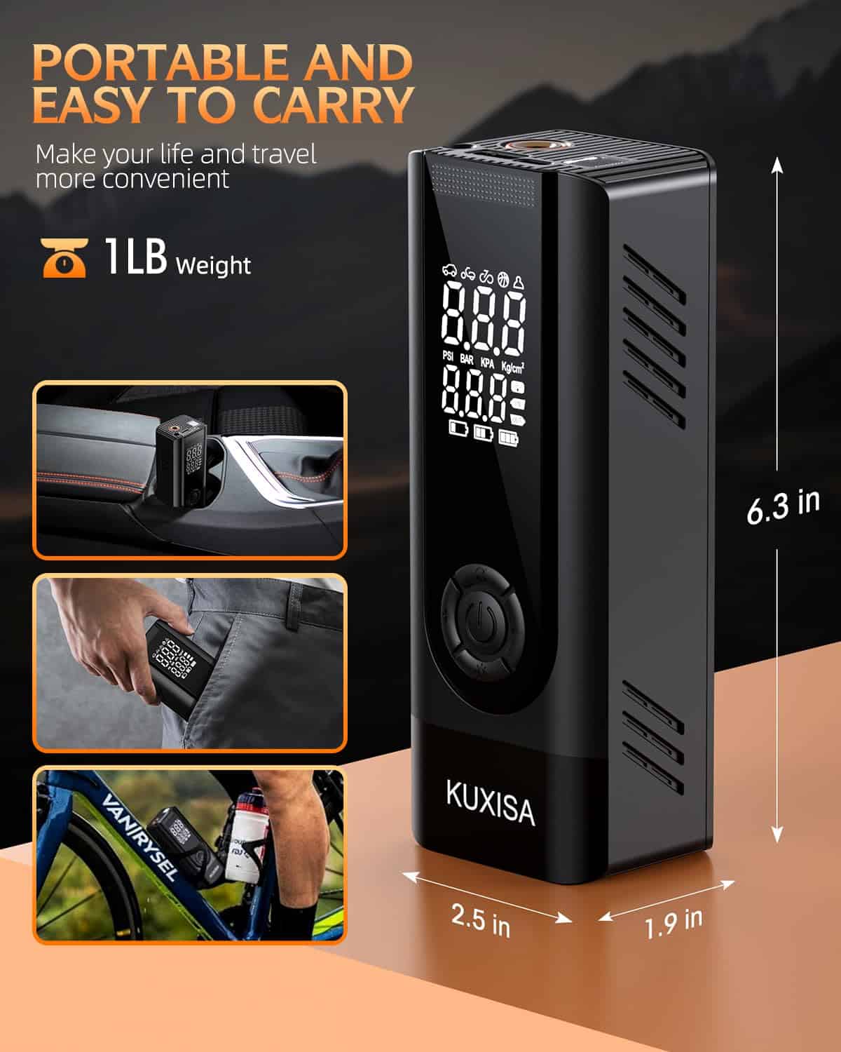 5. Lista de empaque El inflador de aire cuenta con un diseño compacto inalámbrico y es lo suficientemente pequeño como para almacenarlo en tu coche, portabicicletas o mochila. Incluye una variedad de accesorios: inflador de neumáticos 1, manguera de aire de conexión 1, boquilla atmosférica 1, boquilla de hinchado 1, adaptador francés 1, aguja para pelotas 1, cable fusible 1, cable de alimentación de CC 1, cable de carga USB 1, manual de usuario 1 y bolsa de almacenamiento 1