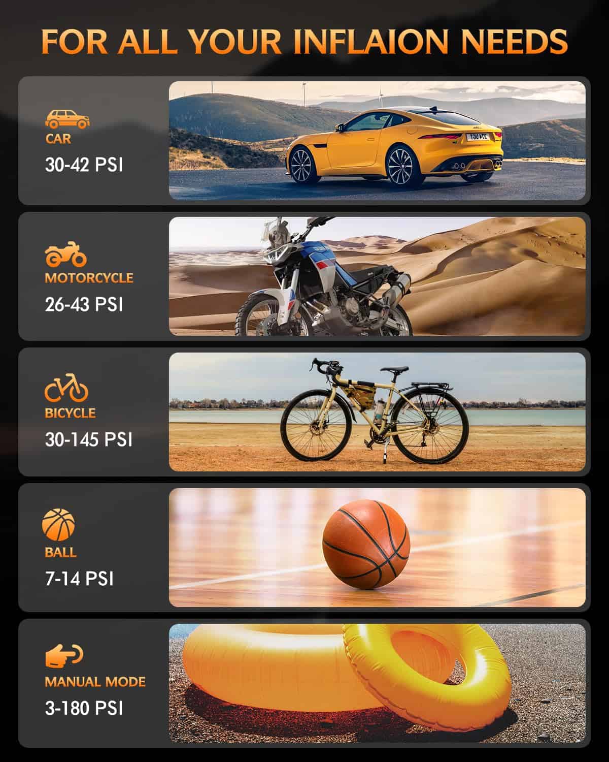 3. 4+ Modos de inflado Tiene cuatro modos de inflado preestablecidos: bicicleta, motocicleta, coche y pelota; cuatro unidades de medición de presión: PSI, KPA, BAR y KG/CM2. El quinto modo personalizado también puede establecer un valor de presión de 3-180PSI en función del objeto de inflado para satisfacer diversas necesidades de inflado. El compresor de aire portátil también viene con una bolsa de almacenamiento especial, que es un producto esencial para la vida cotidiana y los viajes.