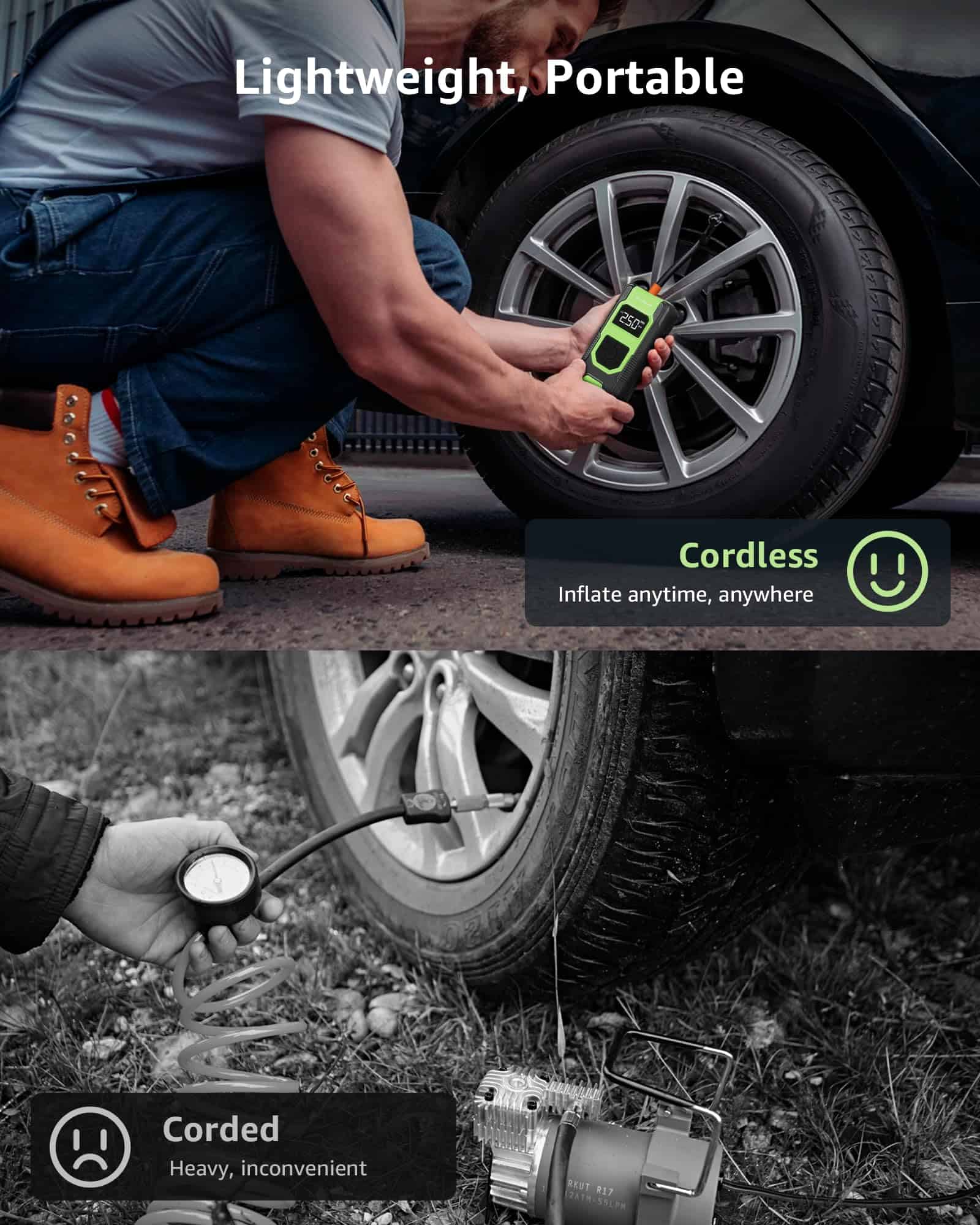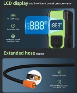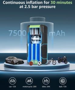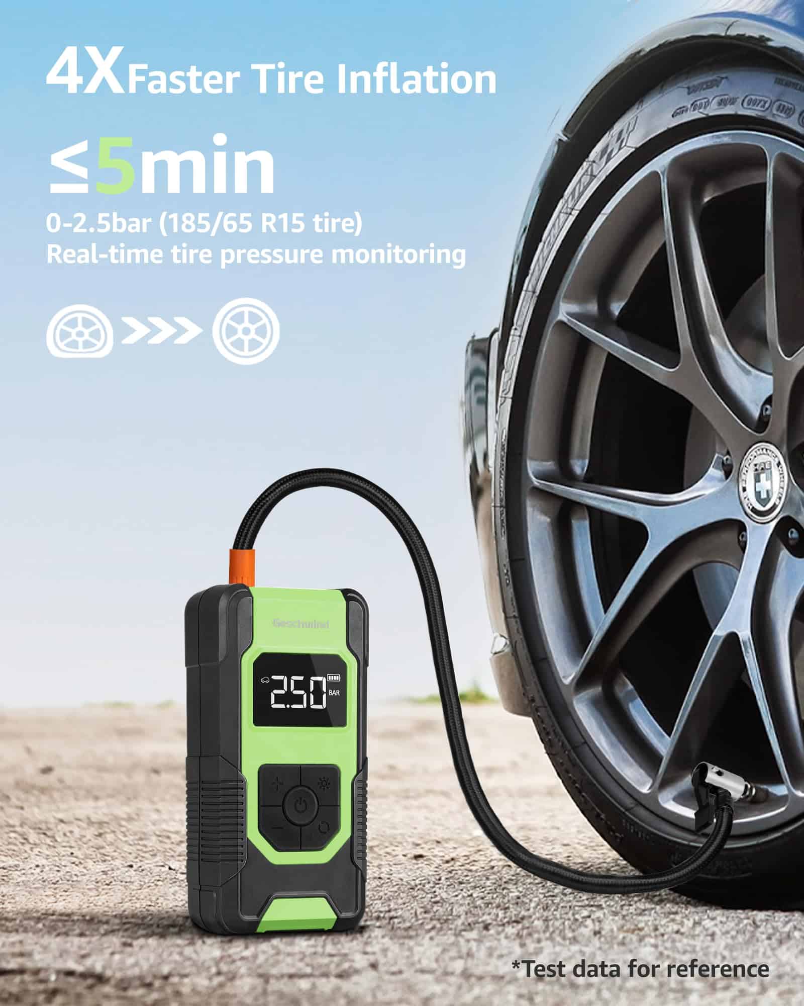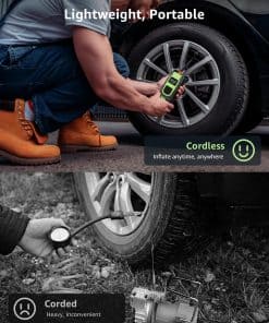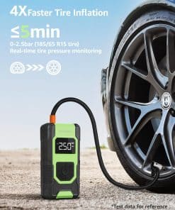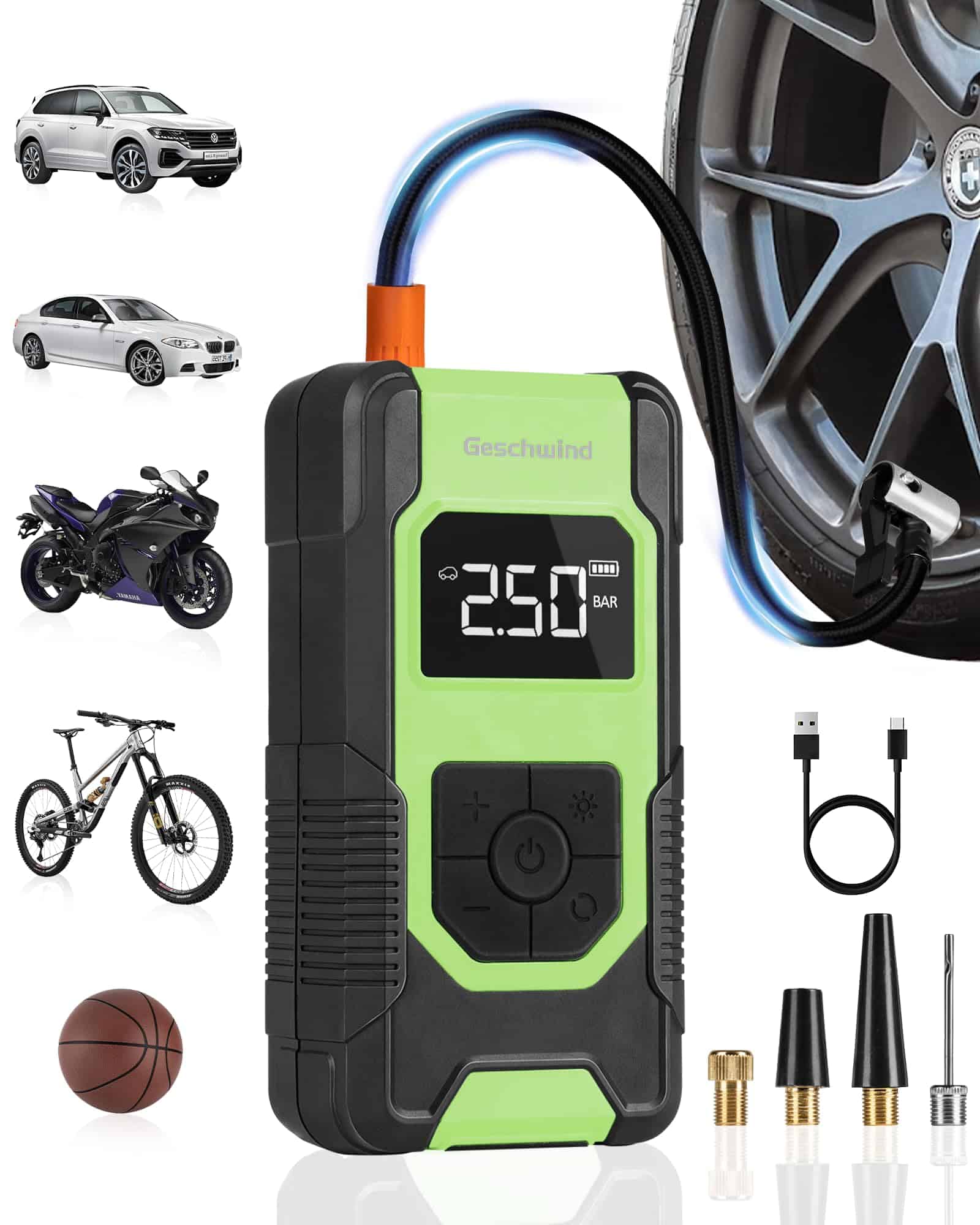 Inflador de neumáticos Geschwind – Compresor de aire portátil, 150 PSI, Bomba de aire eléctrica para neumáticos de coche inalámbrica, 4 veces más rápido con manómetro digital para coche, motocicleta, bicicleta, balón. Este inflador de neumáticos portátil cuenta con una inflación 4 veces más rápida, con 25000+ RPM que puede inflar un neumático de coche de 0 a 2.5 bar en solo cinco minutos. Además, tarda menos de un minuto en llenar un neumático de tamaño 185/65 R15 (28-35PSI). La precisión de la inflación es de hasta 0.1PSI, lo que garantiza un inflado preciso y rápido. La batería de este inflador de neumáticos inalámbrico tiene una larga vida útil, pudiendo trabajar continuamente durante más de 30 minutos cuando está completamente cargada. Puede inflar hasta 12 neumáticos de coche de forma ininterrumpida. El material ignífugo y la protección contra sobrecalentamiento hacen que el proceso sea más seguro. El diseño del tubo largo antiescaldadura extendido de 19.7 pulgadas permite inflar en cualquier ángulo deseado con comodidad y seguridad. Este compresor de aire ofrece 4 modos preestablecidos (coche, motocicleta, bicicleta, balón) y 1 modo manual, además de 4 unidades preestablecidas (PSl, BAR, KPA, kg/cm ), lo que le permite seleccionar el modo de uso deseado con solo un interruptor de tecla. Una vez que la presión preestablecida es alcanzada, se detendrá automáticamente, ahorrándole tiempo y esfuerzo. Ligero y portátil, esta bomba de aire para coche es fácil de llevar a todas partes. Se puede almacenar en el maletero o en el compartimento de almacenamiento del coche gracias a su diseño compacto y ligero. Incluye 4 boquillas diferentes para adaptarse a todo tipo de neumáticos y equipos inflables. Además, la parte superior de la bomba de neumáticos cuenta con una luz LED que facilita el inflado y el cambio de neumáticos en situaciones de poca luz. Además, dispone de puertos USB-C de 5V/2A y USB-A de 5V/2A en la parte inferior, que se pueden utilizar como fuente de alimentación de emergencia para su teléfono en caso de necesidad. Con el inflador de neumáticos Geschwind, tendrá todo lo necesario para mantener sus neumáticos y equipos inflables en perfectas condiciones en todo momento.