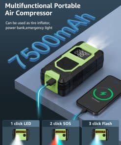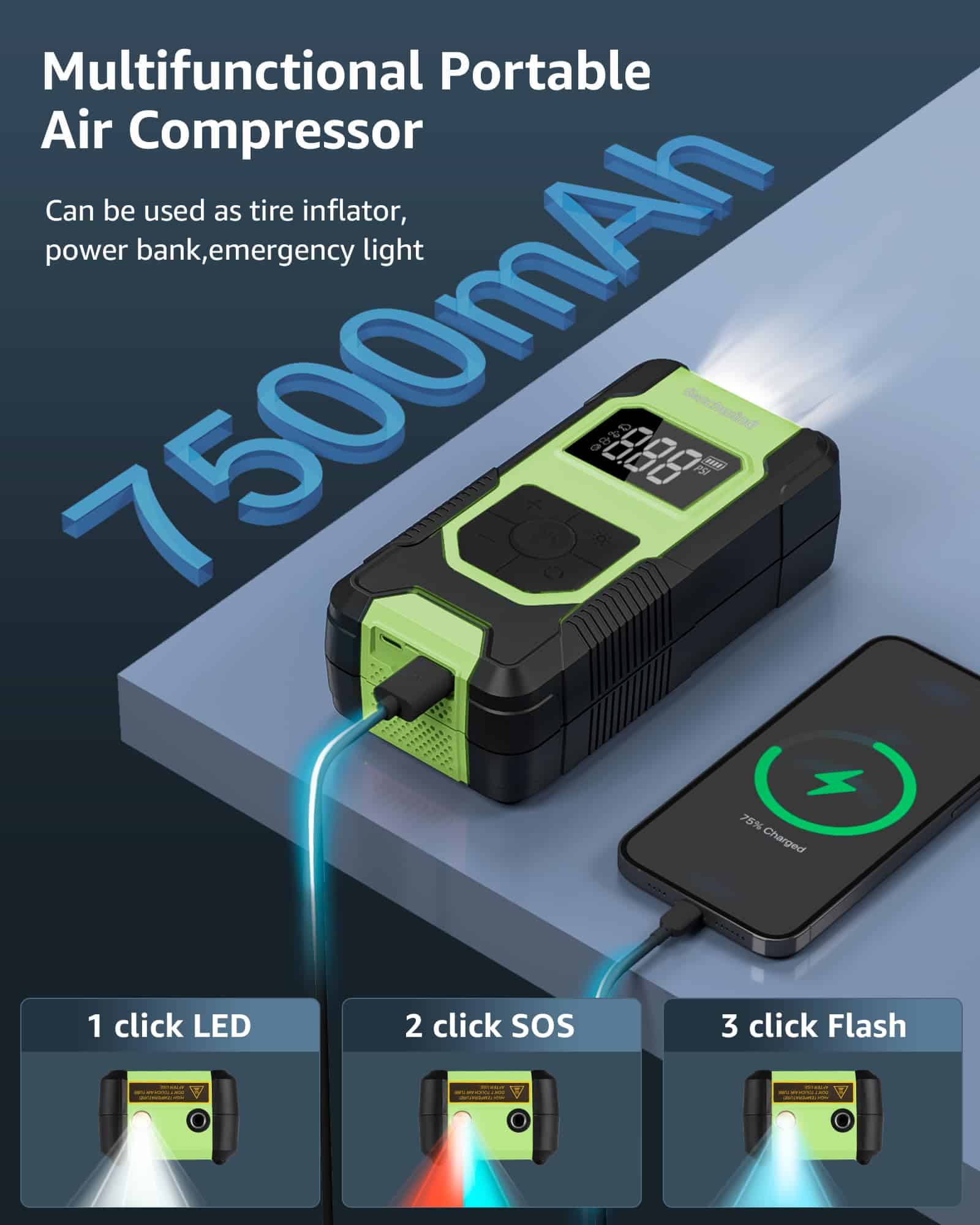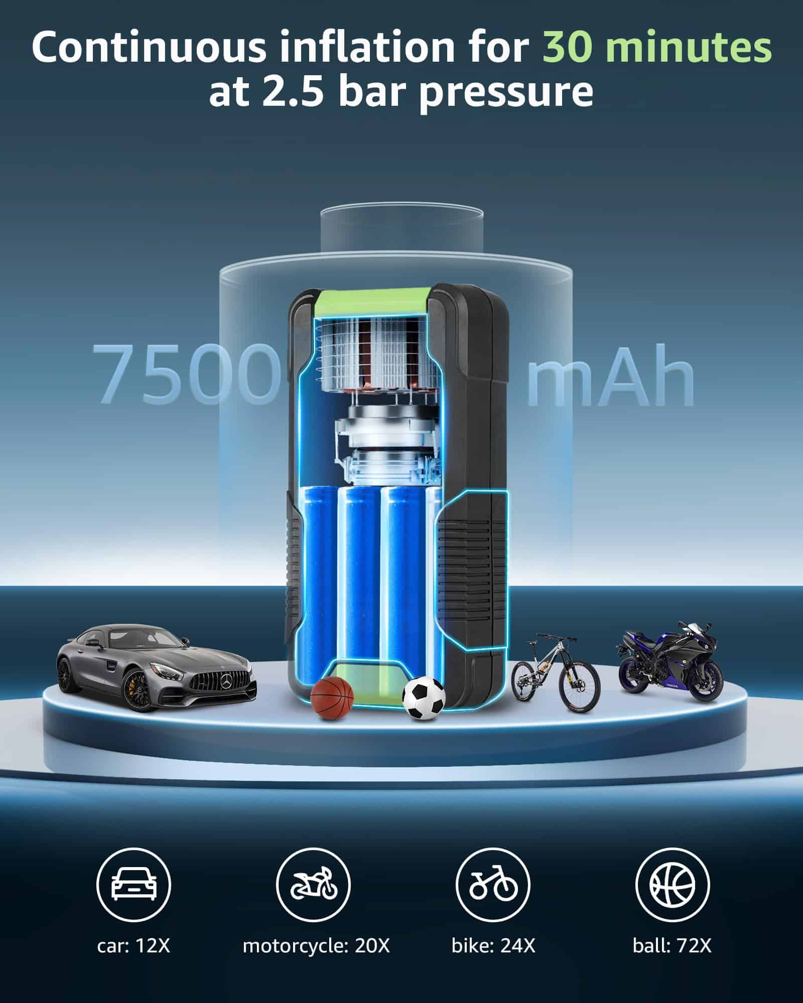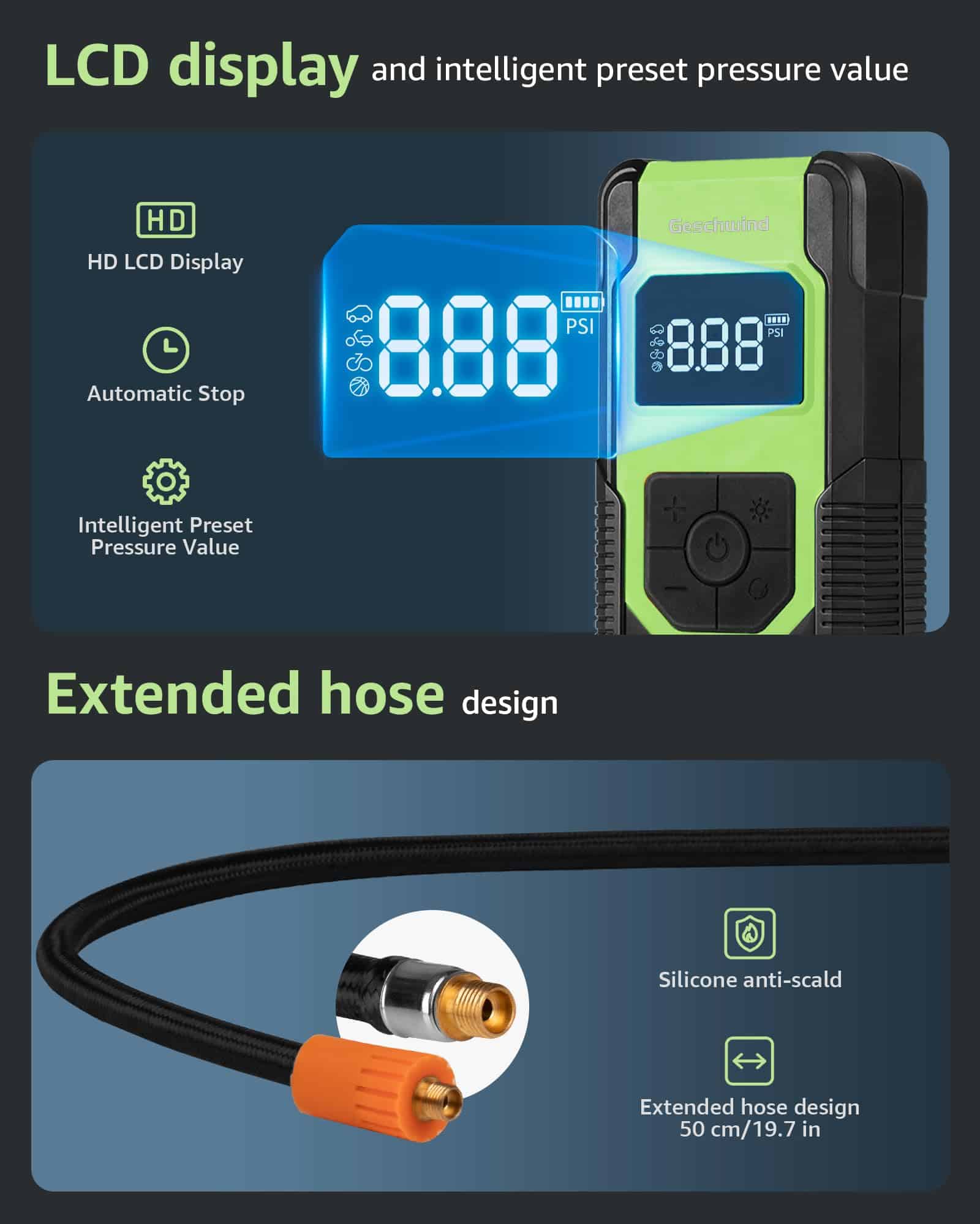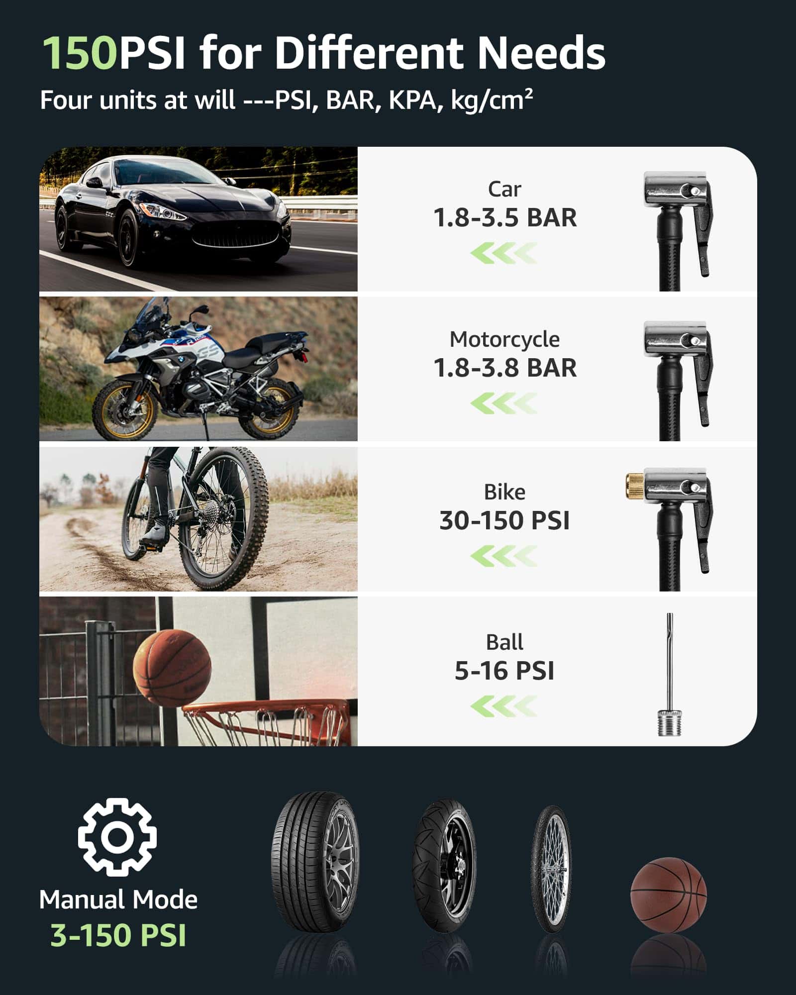 Inflador de neumáticos Geschwind – Compresor de aire portátil, 150 PSI, Bomba de aire eléctrica para neumáticos de coche inalámbrica, 4 veces más rápido con manómetro digital para coche, motocicleta, bicicleta, balón. Este inflador de neumáticos portátil cuenta con una inflación 4 veces más rápida, con 25000+ RPM que puede inflar un neumático de coche de 0 a 2.5 bar en solo cinco minutos. Además, tarda menos de un minuto en llenar un neumático de tamaño 185/65 R15 (28-35PSI). La precisión de la inflación es de hasta 0.1PSI, lo que garantiza un inflado preciso y rápido. La batería de este inflador de neumáticos inalámbrico tiene una larga vida útil, pudiendo trabajar continuamente durante más de 30 minutos cuando está completamente cargada. Puede inflar hasta 12 neumáticos de coche de forma ininterrumpida. El material ignífugo y la protección contra sobrecalentamiento hacen que el proceso sea más seguro. El diseño del tubo largo antiescaldadura extendido de 19.7 pulgadas permite inflar en cualquier ángulo deseado con comodidad y seguridad. Este compresor de aire ofrece 4 modos preestablecidos (coche, motocicleta, bicicleta, balón) y 1 modo manual, además de 4 unidades preestablecidas (PSl, BAR, KPA, kg/cm ), lo que le permite seleccionar el modo de uso deseado con solo un interruptor de tecla. Una vez que la presión preestablecida es alcanzada, se detendrá automáticamente, ahorrándole tiempo y esfuerzo. Ligero y portátil, esta bomba de aire para coche es fácil de llevar a todas partes. Se puede almacenar en el maletero o en el compartimento de almacenamiento del coche gracias a su diseño compacto y ligero. Incluye 4 boquillas diferentes para adaptarse a todo tipo de neumáticos y equipos inflables. Además, la parte superior de la bomba de neumáticos cuenta con una luz LED que facilita el inflado y el cambio de neumáticos en situaciones de poca luz. Además, dispone de puertos USB-C de 5V/2A y USB-A de 5V/2A en la parte inferior, que se pueden utilizar como fuente de alimentación de emergencia para su teléfono en caso de necesidad. Con el inflador de neumáticos Geschwind, tendrá todo lo necesario para mantener sus neumáticos y equipos inflables en perfectas condiciones en todo momento.