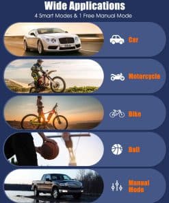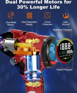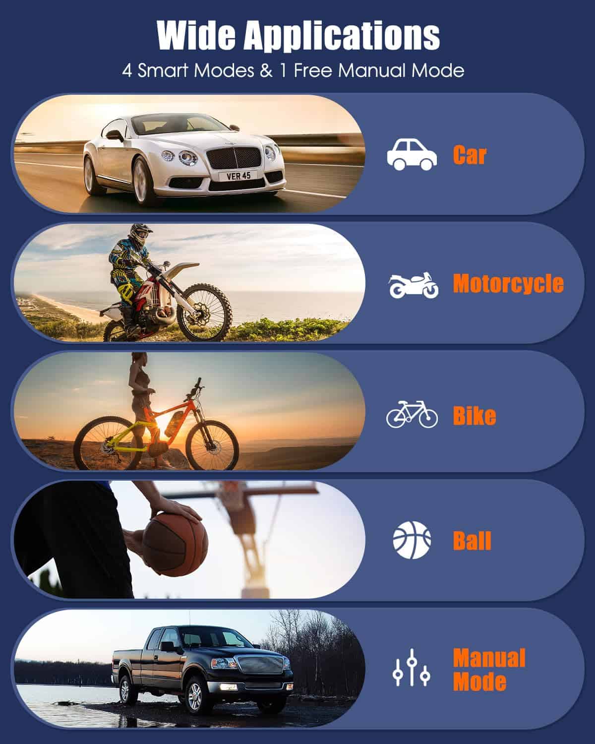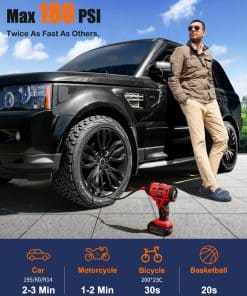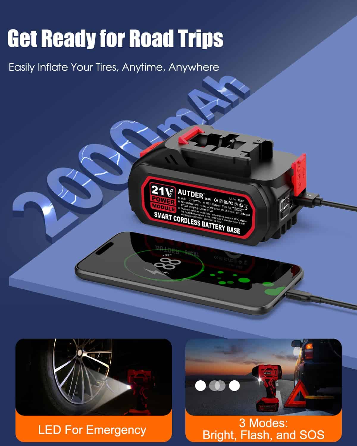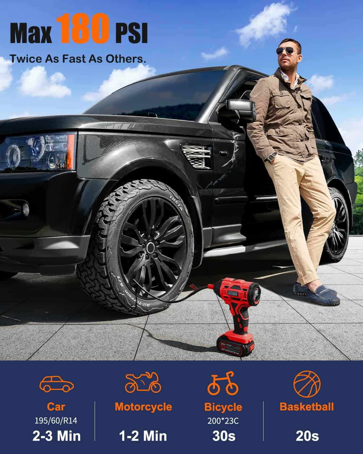 Inflado ultrarrápido y potencia recargable. Con una presión máxima de 180PSI y un volumen de aire de 50L/Min, esta potente bomba de aire infla un neumático 195/55/R16 en solo 2 minutos y 30 segundos, el doble de rápido que los infladores inalámbricos estándar. La batería de 21V y 2000mAh se carga completamente en 2.5 horas, garantizando un uso rápido y eficiente siempre que sea necesario. Uso versátil y multiusos. Diseñado para una variedad de inflables, incluidos autos, SUV, motocicletas, bicicletas, vehículos eléctricos, pelotas deportivas y juguetes inflables. Infla completamente 8 neumáticos de automóvil, 14 neumáticos de motocicleta o 60 neumáticos de bicicleta con una carga completa (Condición del neumático del 50% al 100%). Nota: No es adecuado para camiones grandes o vehículos pesados.