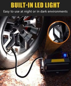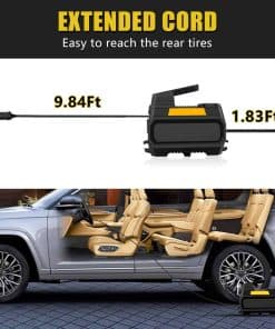 1. FÁCIL DE USAR Y RÁPIDO INFLADO Conecta el cable de alimentación del inflador de neumáticos portátil al enchufe de 12V del coche, luego inserta la boquilla de inflado en la válvula del neumático, ajusta la presión del neumático requerida y presiona el interruptor para comenzar a inflar. Hasta 150 PSI, puede inflar el neumático del coche 195/55/R15 de 0 a 35 psi en menos de 4.5 minutos.