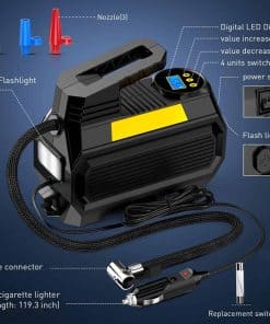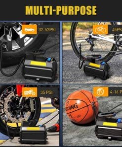 4. AMPLIA GAMA DE APLICACIONES La bomba de aire para neumáticos tiene un cable de alimentación de 3 metros y 3 boquillas adicionales que permiten llegar a todos los neumáticos de tus coches, SUVs, motocicletas, bicicletas, pelotas, globos, colchones y otros inflables. (NOTA: NO ES ADECUADO PARA CAMIONES O CAMIONES GRANDES). Equipado con una linterna LED brillante para uso de emergencia.