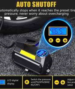 2. DETECCIÓN DE PRESIÓN Y PANTALLA DIGITAL Conecta la bomba de inflado al enchufe de 12V del coche y a la válvula del neumático, y se mostrará la presión actual del neumático. El compresor de aire portátil está equipado con una pantalla grande de alta precisión y alta luminosidad para ayudarte a verificar la presión de los neumáticos y preajustar los valores de presión de los neumáticos.