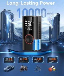 2. Batería de 10000 mAh: Este compresor de aire portátil para neumáticos está equipado con una batería recargable de 10000 mAh, nuestro inflador de neumáticos proporciona suficiente potencia para manejar varios neumáticos con una sola carga. Perfecto para viajes largos o desplazamientos diarios.