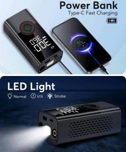 5. Carga Type-C, Power Bank, Luz LED: Este compresor de neumáticos portátil se carga rápidamente utilizando Type-C para recargas eficientes. También funciona como una power bank. La luz LED cuenta con tres modos, incluyendo SOS y Estroboscópico, convirtiéndolo en un inflador de aire esencial para neumáticos de coches, bicicletas, motocicletas y más.