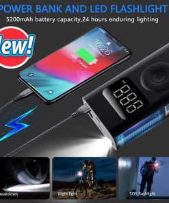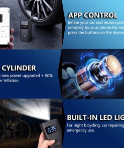 4. CONTROL INTELIGENTE DE LA APLICACIÓN Y 3 MODOS DE LUZ. Inflador de neumáticos para coche disponible para iOS y Android. Función para monitorización y ajuste de la presión de aire en tiempo real por teléfono móvil. En la parte superior de este inflador de neumáticos para coche hay una luz LED que proporciona comodidad para inflar y cambiar neumáticos en la oscuridad.