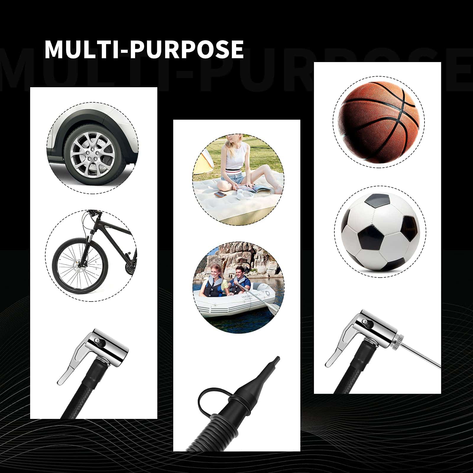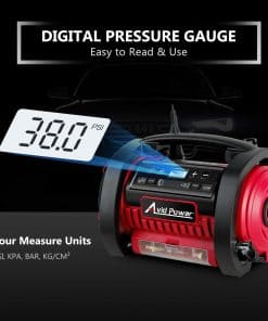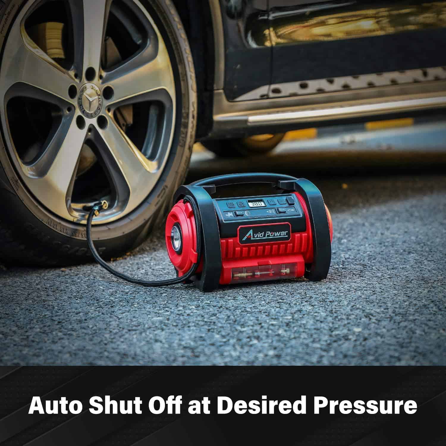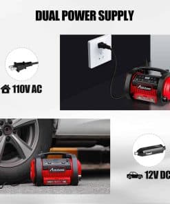 12V DC / 110V AC Power Supply AC/DC power switch hacen que este compresor de aire sea más útil y conveniente, ya que puedes usarlo en cualquier lugar. Puedes elegir conectarlo con el enchufe de encendedor de cigarrillos de 12V del automóvil o con el enchufe de corriente de 120V de casa. Perfecto para usar en interiores y durante los viajes. Este inflador de neumáticos cuenta con interruptor de inflado y desinflado y dos tipos de mangueras. La manguera de alta presión para inflar artículos de alta presión como neumáticos de automóviles y motocicletas, pelotas deportivas y más. La manguera de alto volumen para inflar o desinflar artículos de bajo presión pero alto volumen como balsas de aire, colchones de aire, flotadores. Auto Shut-off Digital Gauge & Bright Led Light: Preset the value you want y la bomba de aire se apagará automáticamente cuando se alcance la presión deseada. La pantalla digital LCD con conversión de unidades (PSI/Bar/KPA) hace que esta unidad sea muy fácil y segura de operar. Las linternas LED ultrabrillantes te brindan servicio de emergencia en la oscuridad. ¿Qué obtendrás? Avid Power 12V/110V Inflador/Desinflador, 3 adaptadores de boquilla, manguera de alto volumen, manual de usuario.