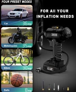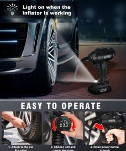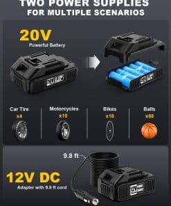 Diseño compacto y portátil: el Compresor de Aire para Neumáticos presenta un diseño portátil de mano que se puede almacenar y transportar fácilmente en tu coche. Tu compra incluye un inflador de neumáticos inalámbrico, un paquete de batería de iones de litio de 20V, un adaptador de corriente de coche de 12V, un cargador de batería, 6 boquillas para diferentes usos, un manual de usuario detallado y una bolsa de herramientas para un almacenamiento conveniente durante tus viajes.