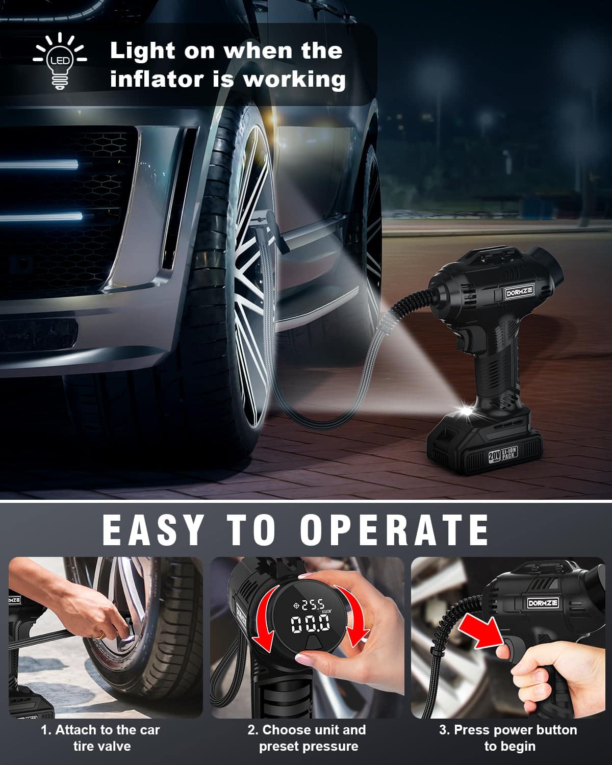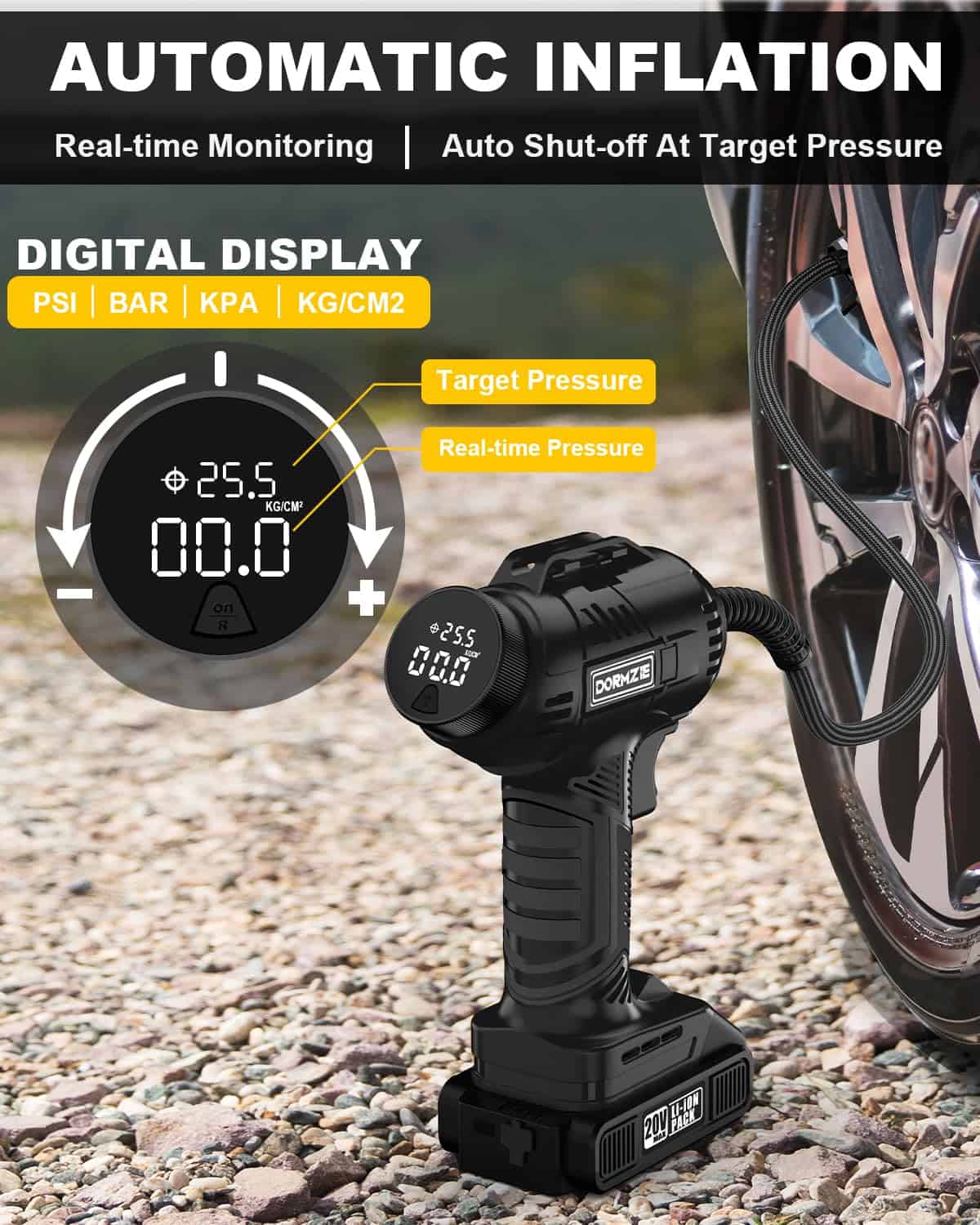Apagado automático y control digital de presión: configura tu presión de aire deseada con facilidad girando el dial, simplificando el proceso en comparación con las presiones de botón. Nuestro compresor de aire se apagará automáticamente al alcanzar la presión objetivo, eliminando así cualquier preocupación de sobreinflado. El medidor de presión digital claro admite 4 cambios de unidades (BAR, KPA, PSI, KG/CM2), lo que garantiza un monitoreo fácil y preciso, con una precisión de +/- 1 PSI para una inflación precisa y precisa en todo momento.