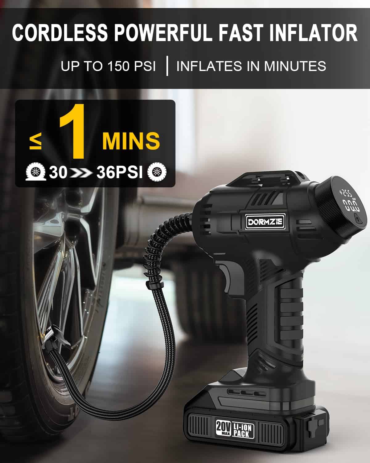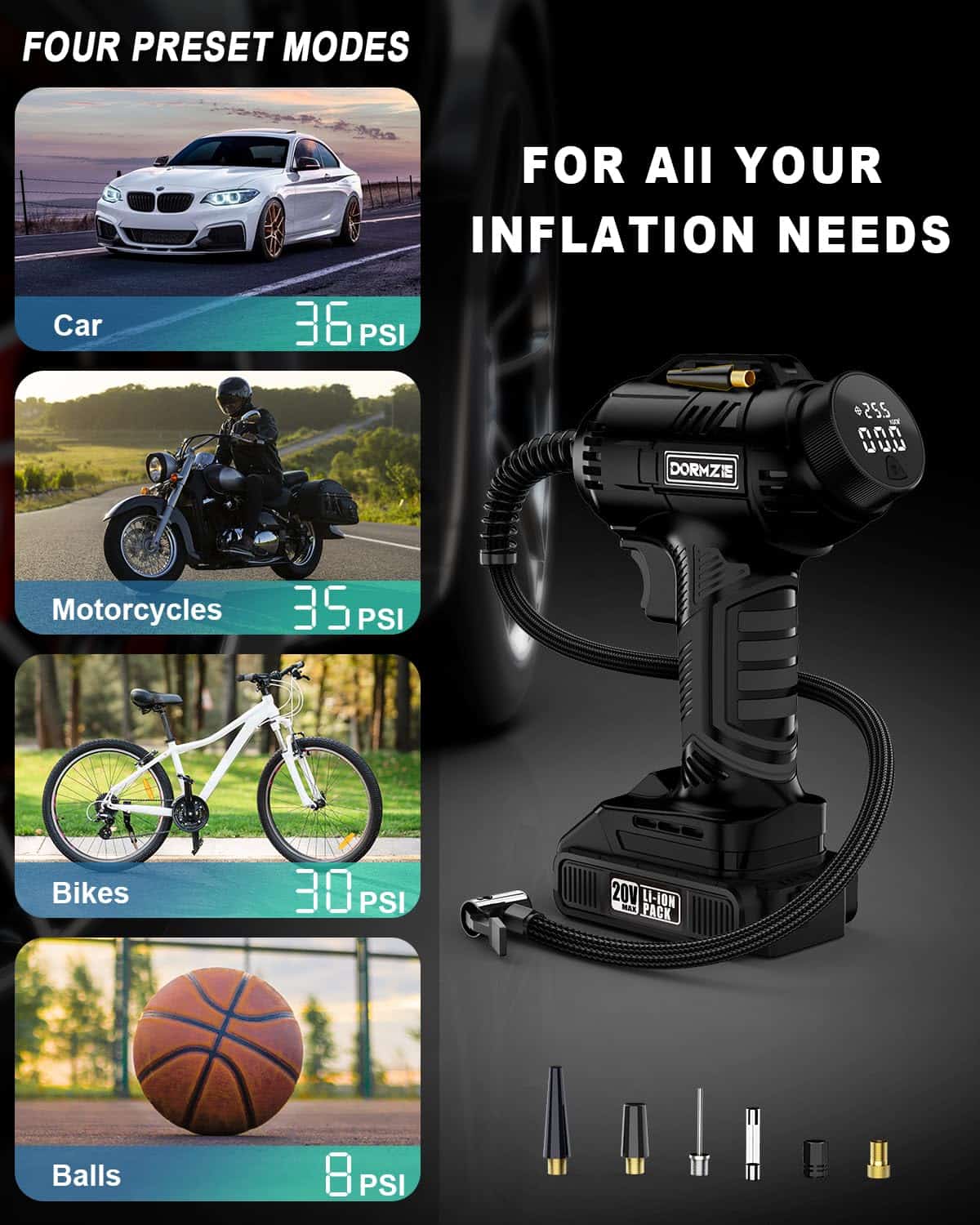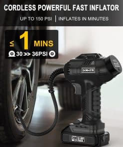 Capacidad de inflación versátil: con una presión máxima de 150 PSI, nuestro inflador de neumáticos DORMZIE es tu compañero confiable y versátil para diversas necesidades de inflado. Ya sea para tu coche, motocicleta, bicicleta, equipos deportivos como pelotas, o incluso globos decorativos, esta bomba de aire portátil de mano está diseñada para manejarlo todo. Solo ten en cuenta que no es adecuado para neumáticos de camiones grandes.