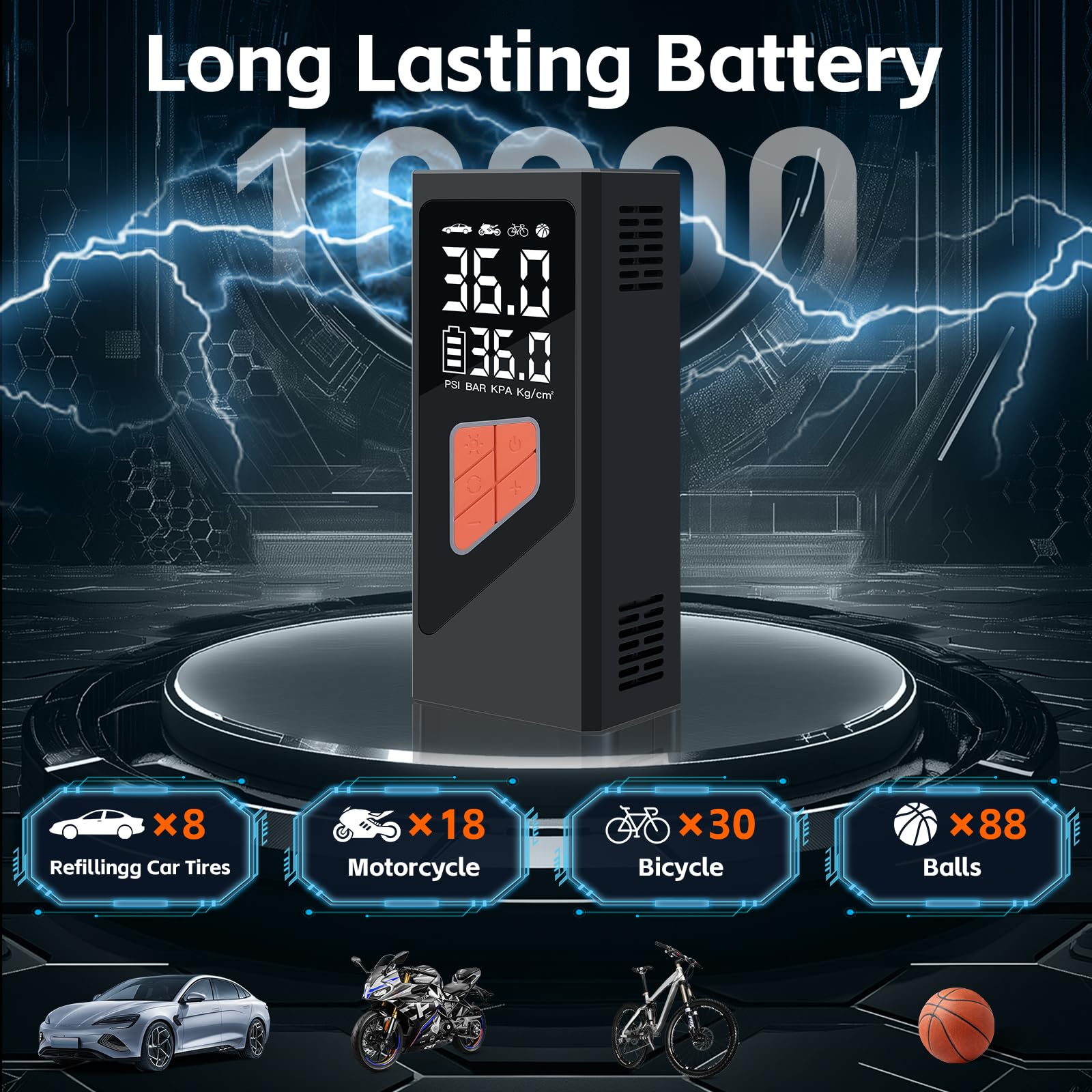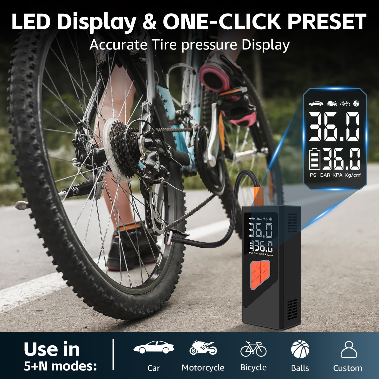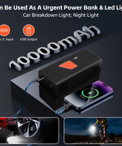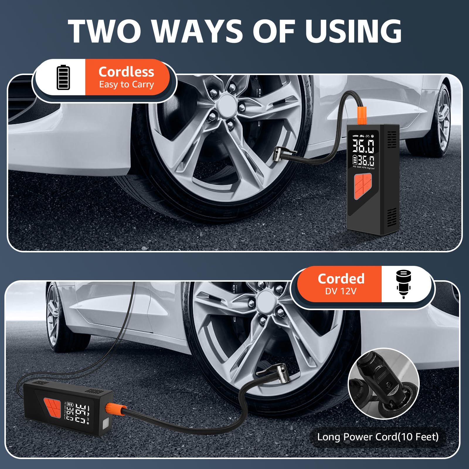 2. Compresor de Aire Inteligente con Apagado Automático Este compresor de aire inflador cuenta con una pantalla LCD doble y un chip avanzado, ofreciendo 5 modos preestablecidos: bicicleta, motocicleta, coche, balón y personalizado, cubriendo diversas necesidades de inflado y convirtiendo al compresor de aire portátil en ideal para uso diario y viajes. Esta bomba de aire eléctrica proporciona monitoreo de presión en tiempo real y preestablecido preciso, admite 4 unidades (BAR, KPA, PSI, KG/CM) con 1 PSI de precisión, asegurando una inflación segura y precisa. El inflador de neumáticos para coche se apaga automáticamente una vez que se alcanza la presión preestablecida, evitando la sobreinflación. 3. Dos Métodos de Inflado La bomba de neumáticos portátil para coche ofrece tanto una batería de iones de litio recargable de 10,000mAh para mayor comodidad inalámbrica como un adaptador de corriente de coche de 12V, garantizando una solución de energía dual confiable para tus viajes. Con el adaptador de DC de 12V como fuente de energía alternativa, nunca tendrás que preocuparte por que se agote la batería del compresor de aire de bolsillo durante tu viaje, ofreciendo una inflación ininterrumpida donde sea que vayas. Esta bomba de aire inalámbrica para neumáticos de coche es un excelente accesorio de viaje para la inflación de neumáticos. 4. Inflador de Aire Multifuncional Este dispositivo compacto no es solo un inflador sin cables para neumáticos sino también una herramienta de emergencia versátil. Este inflador de neumáticos eléctrico para coche cuenta con una luz LED para inflar en la oscuridad, cambiar neumáticos o señalizar a otros vehículos por la noche. Además, con un puerto de carga de tipo C y un puerto de salida USB de 5V/2A, la bomba de aire con batería puede duplicar como una fuente de poder de emergencia para tus dispositivos electrónicos. 5. Fácil de Usar y Todo en Una Caja Compresor de Aire Portátil El inflador de neumáticos inalámbrico compresor de aire portátil presenta un diseño compacto y portátil, completo con una caja de almacenamiento para mantener todos los accesorios organizados. Esta bomba de aire portátil es perfecta para un almacenamiento fácil en coches, portabicicletas o mochilas, convirtiéndola en ideal para inflar neumáticos durante los viajes o en casa.