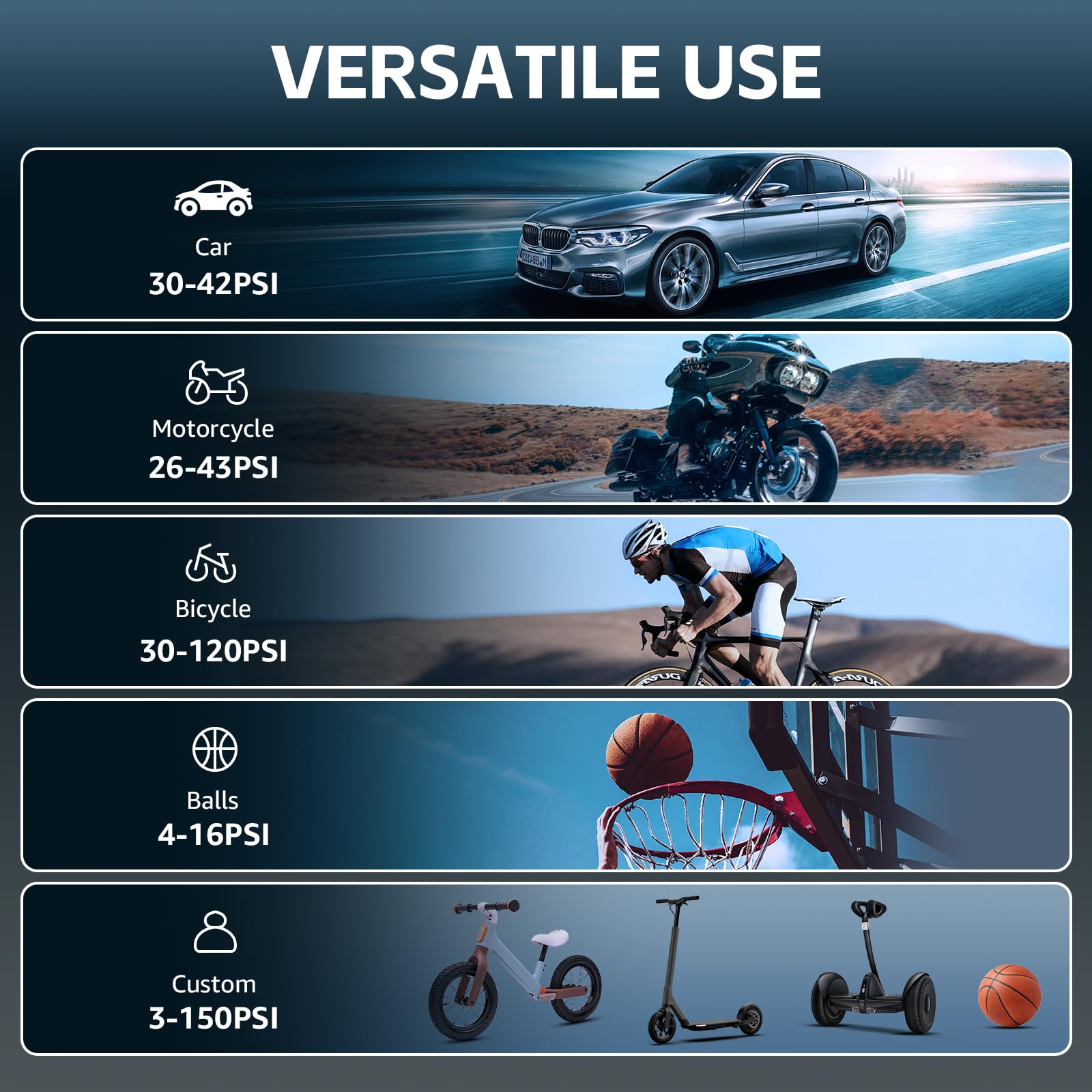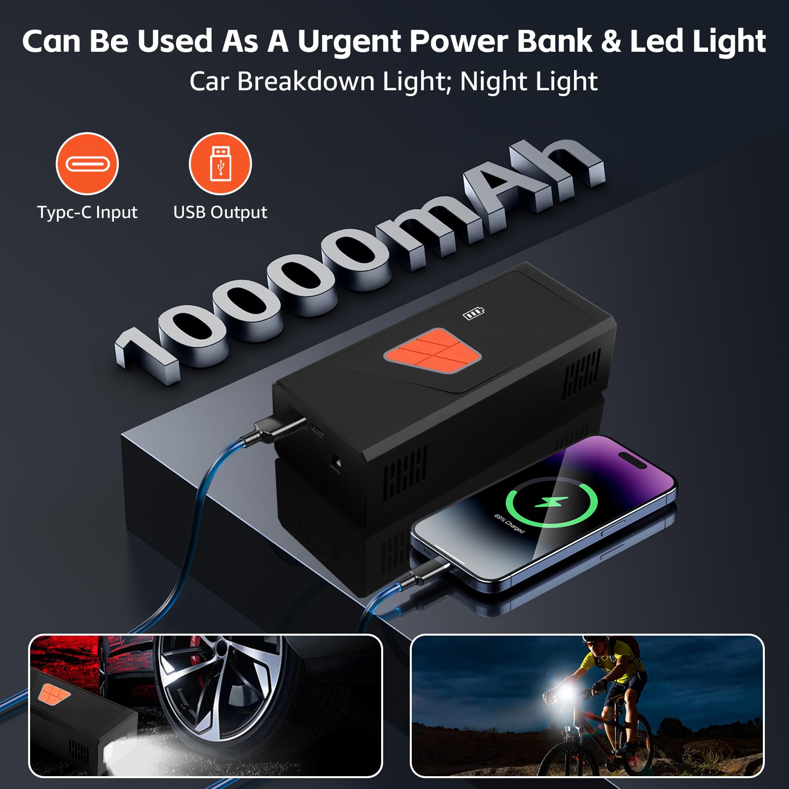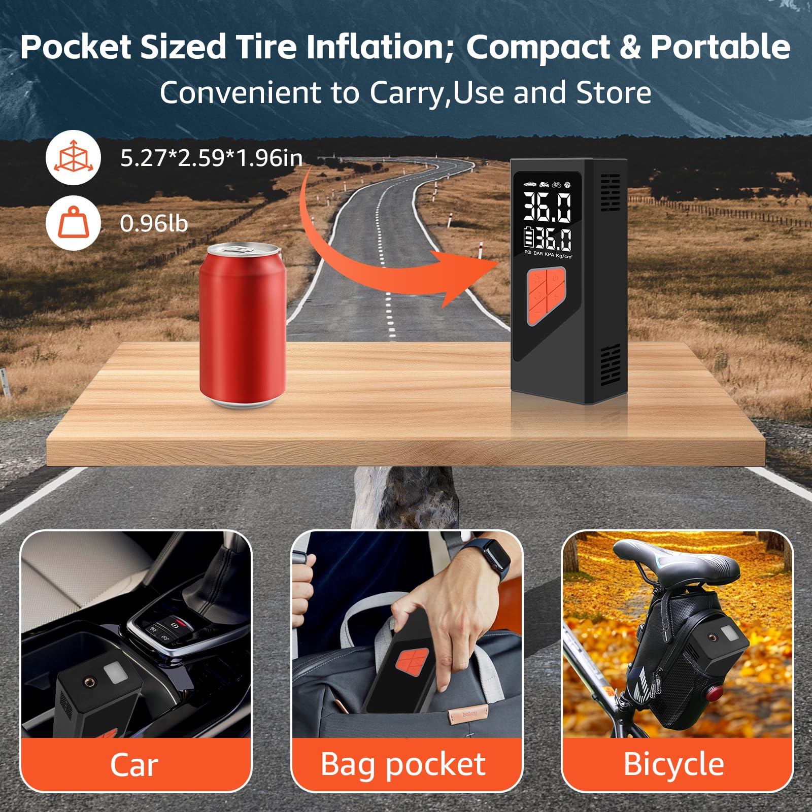 2. Compresor de Aire Inteligente con Apagado Automático Este compresor de aire inflador cuenta con una pantalla LCD doble y un chip avanzado, ofreciendo 5 modos preestablecidos: bicicleta, motocicleta, coche, balón y personalizado, cubriendo diversas necesidades de inflado y convirtiendo al compresor de aire portátil en ideal para uso diario y viajes. Esta bomba de aire eléctrica proporciona monitoreo de presión en tiempo real y preestablecido preciso, admite 4 unidades (BAR, KPA, PSI, KG/CM) con 1 PSI de precisión, asegurando una inflación segura y precisa. El inflador de neumáticos para coche se apaga automáticamente una vez que se alcanza la presión preestablecida, evitando la sobreinflación. 3. Dos Métodos de Inflado La bomba de neumáticos portátil para coche ofrece tanto una batería de iones de litio recargable de 10,000mAh para mayor comodidad inalámbrica como un adaptador de corriente de coche de 12V, garantizando una solución de energía dual confiable para tus viajes. Con el adaptador de DC de 12V como fuente de energía alternativa, nunca tendrás que preocuparte por que se agote la batería del compresor de aire de bolsillo durante tu viaje, ofreciendo una inflación ininterrumpida donde sea que vayas. Esta bomba de aire inalámbrica para neumáticos de coche es un excelente accesorio de viaje para la inflación de neumáticos. 4. Inflador de Aire Multifuncional Este dispositivo compacto no es solo un inflador sin cables para neumáticos sino también una herramienta de emergencia versátil. Este inflador de neumáticos eléctrico para coche cuenta con una luz LED para inflar en la oscuridad, cambiar neumáticos o señalizar a otros vehículos por la noche. Además, con un puerto de carga de tipo C y un puerto de salida USB de 5V/2A, la bomba de aire con batería puede duplicar como una fuente de poder de emergencia para tus dispositivos electrónicos. 5. Fácil de Usar y Todo en Una Caja Compresor de Aire Portátil El inflador de neumáticos inalámbrico compresor de aire portátil presenta un diseño compacto y portátil, completo con una caja de almacenamiento para mantener todos los accesorios organizados. Esta bomba de aire portátil es perfecta para un almacenamiento fácil en coches, portabicicletas o mochilas, convirtiéndola en ideal para inflar neumáticos durante los viajes o en casa.