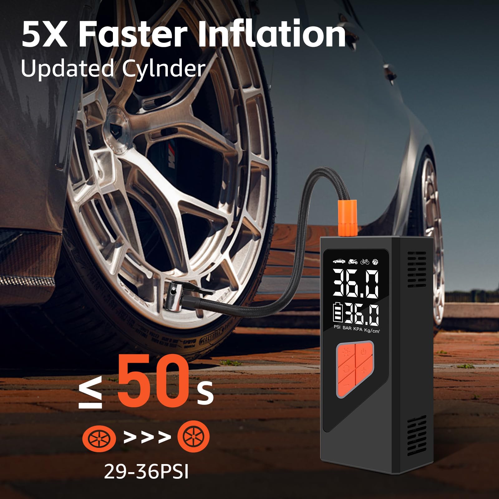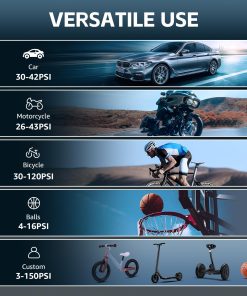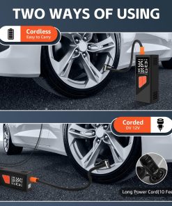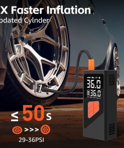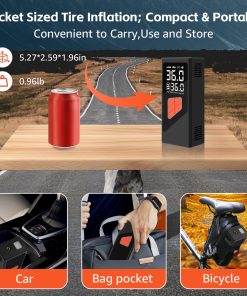 1. Potente Inflador de Neumáticos 5X Eficiente KanYool inflador de neumáticos portátil para coche está construido con materiales de alta calidad, garantizando durabilidad y ofreciendo un rendimiento superior. Con una presión máxima de 150 PSI, este inflador de neumáticos inalámbrico infla los neumáticos 5 veces más rápido que las bombas estándar de 120 PSI, ofreciendo una inflación rápida y eficiente. Este inflador de neumáticos portátil es perfecto para coches, camiones, SUVs, motocicletas y bicicletas, permitiéndote inflar los neumáticos de tu vehículo en solo minutos, haciendo tus viajes más convenientes y sin preocupaciones.