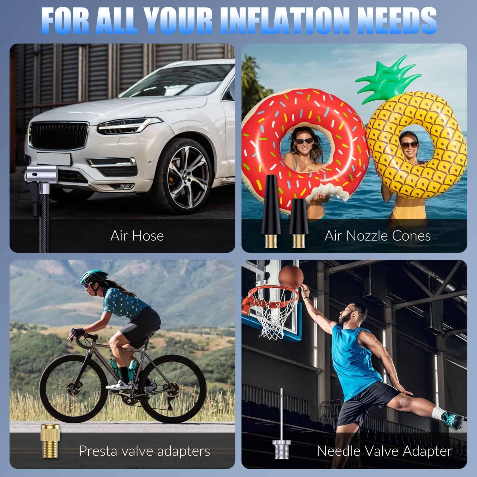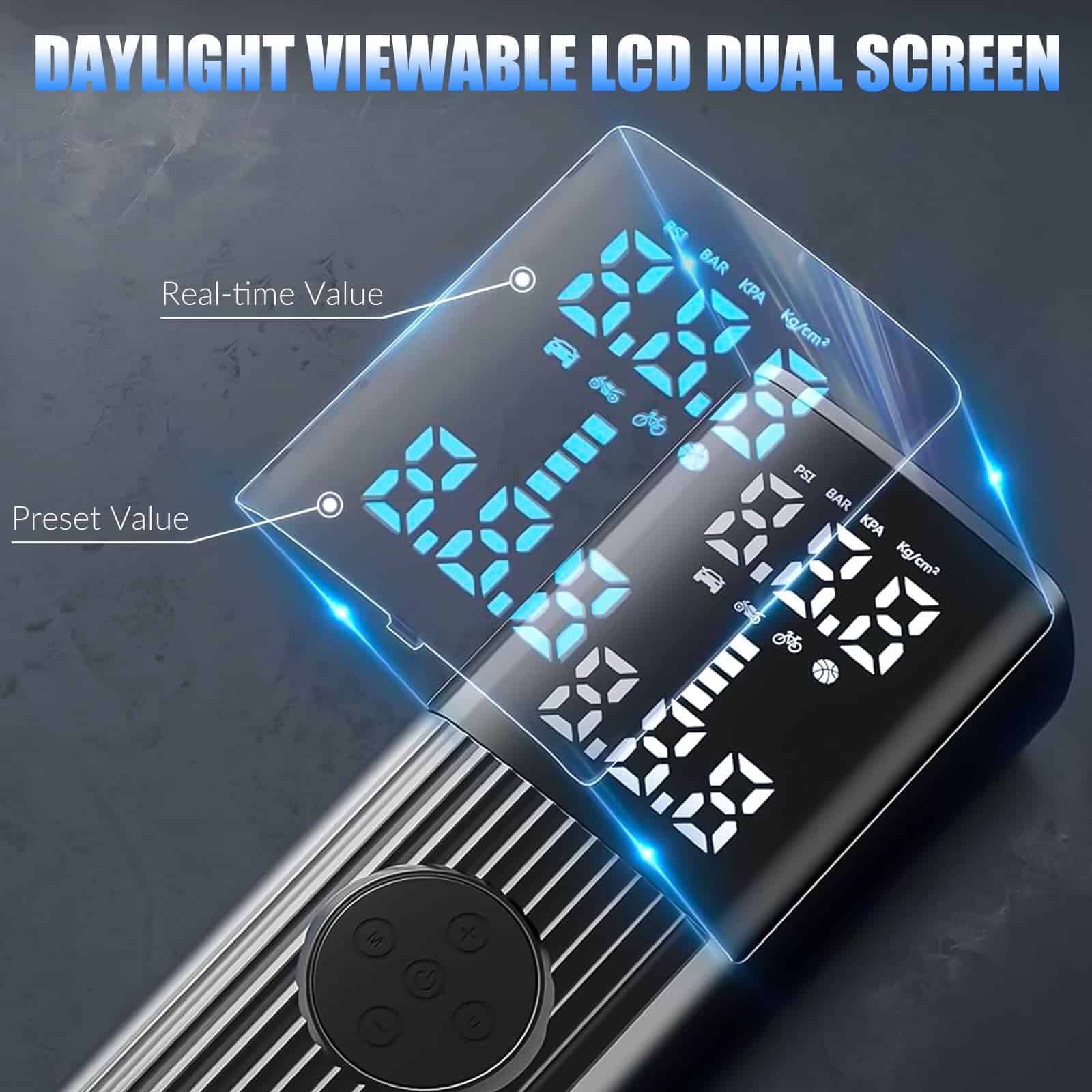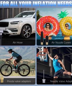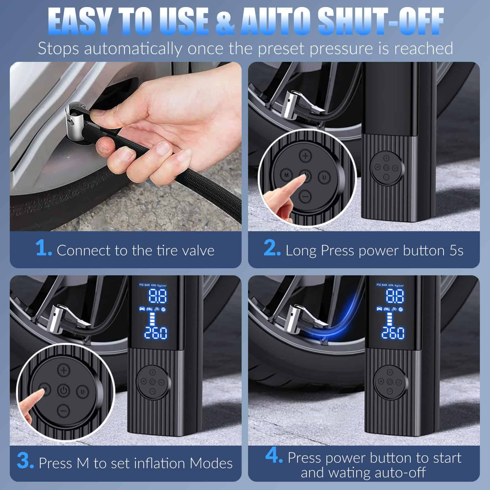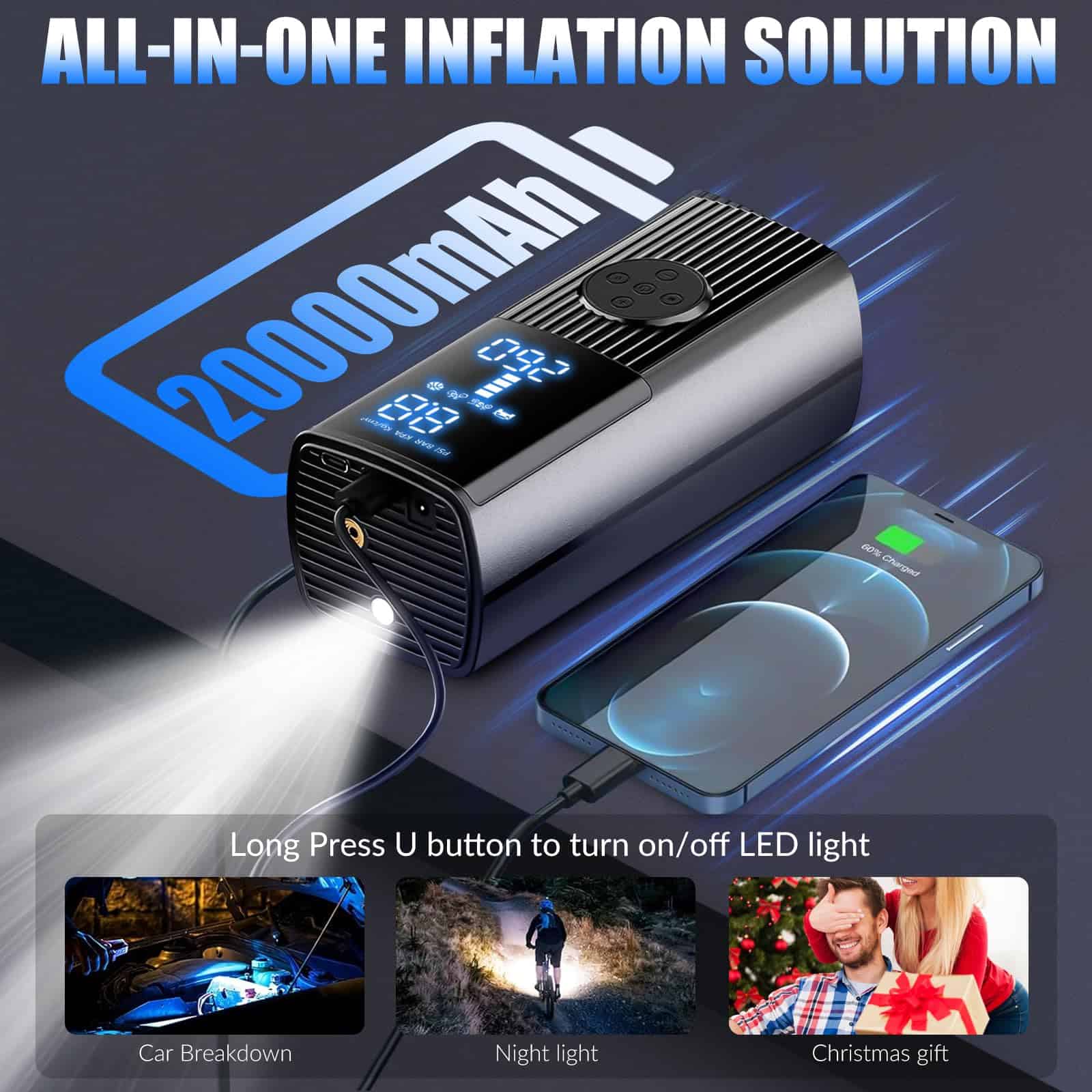 1. Batería de alta capacidad y fácil de usar. 2. Pantalla dual y luz LED. 3. Presión preestablecida y apagado automático. 4. Solución de inflado todo en uno y portátil. 5. Lo que obtienes.