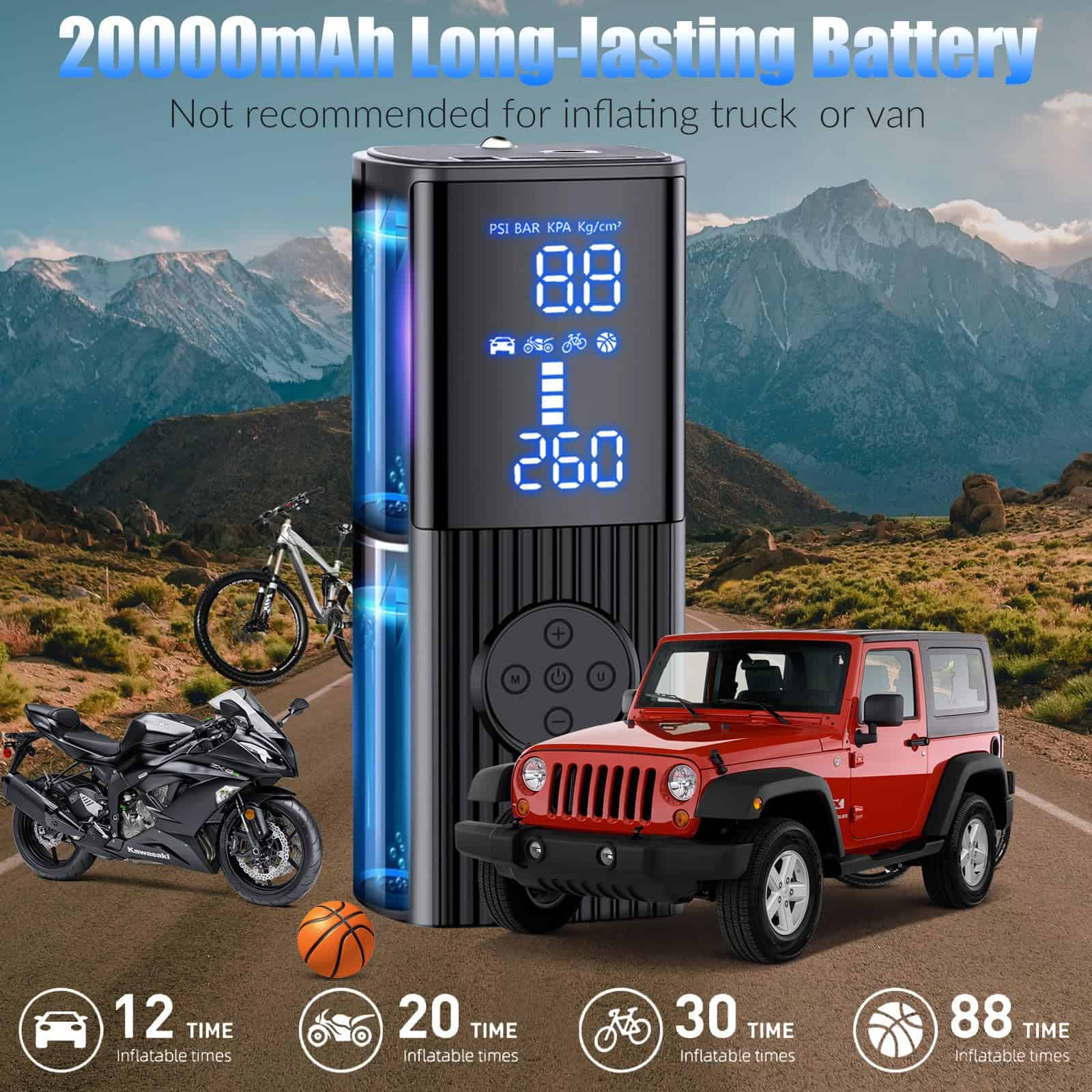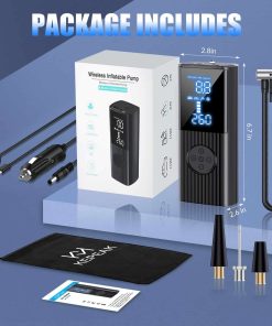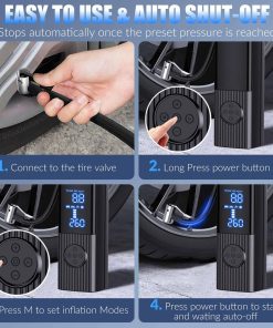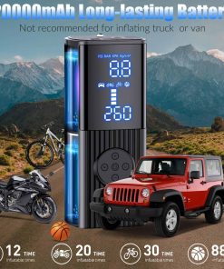 El inflador de neumáticos portátil está equipado con una batería recargable de 20000mAh, que puede proporcionar una autonomía continua inalámbrica de hasta 1 hora. Simplemente conecta la manguera de aire a tu coche y presiona el botón central 5 segundos en el compresor de aire portátil para empezar. Por favor, carga el inflador de neumáticos durante 3 segundos para activarlo antes del primer uso. La pantalla dual LCD precisa muestra la presión de los neumáticos en tiempo real y el valor preestablecido de la presión de los neumáticos, facilitando la monitorización del estado de la presión de los neumáticos. El inflador de neumáticos para coche equipado con brillantes luces LED no solo puede ser útil durante los cambios de neumáticos nocturnos, sino que también se puede utilizar como linterna para buscar las llaves caídas en la oscuridad. Mantén pulsado el botón «U» para encender la luz de emergencia LED. Utiliza el botón «U» para cambiar entre unidades de presión PSI, KPA, BAR y KG/CM. Utiliza el botón «M» para seleccionar los modos de inflado: bicicleta, motocicleta, coche y pelota. Utiliza los botones «+» y «-» para personalizar la configuración deseada de la presión. Presetea fácilmente tu presión deseada, el inflador de aire portátil se detendrá automáticamente una vez que alcance la presión correcta, evitando problemas de sobreinflado. Con puertos de entrada y salida, el inflador de neumáticos portátil puede utilizarse como fuente de alimentación de emergencia para tu teléfono. El inflador de aire para neumáticos viene con boquillas adicionales que lo hacen perfecto para todo tipo de neumáticos, motocicletas, bicicletas, RV, neumáticos de coche, baloncesto e inflables. Diseño compacto y ligero, el compresor de aire para neumáticos se puede almacenar fácilmente en coches, portabicicletas o mochilas. Nota: No recomendable inflar camiones o furgonetas. Incluye 1 inflador de neumáticos portátil, 1 manguera de aire, 2 conos de boquilla de aire, 1 adaptador de válvula de aguja, 1 adaptador de Presta a Schrader, 1 cable de encendedor de cigarrillos DC de 9.84 pies 12V, 1 bolsa con cordón, 1 manual de usuario en español. Si tienes alguna pregunta o inquietud, no dudes en contactarnos. Por favor, deja descansar al inflador de neumáticos durante al menos 10 minutos después de cada uso de 10 minutos.
