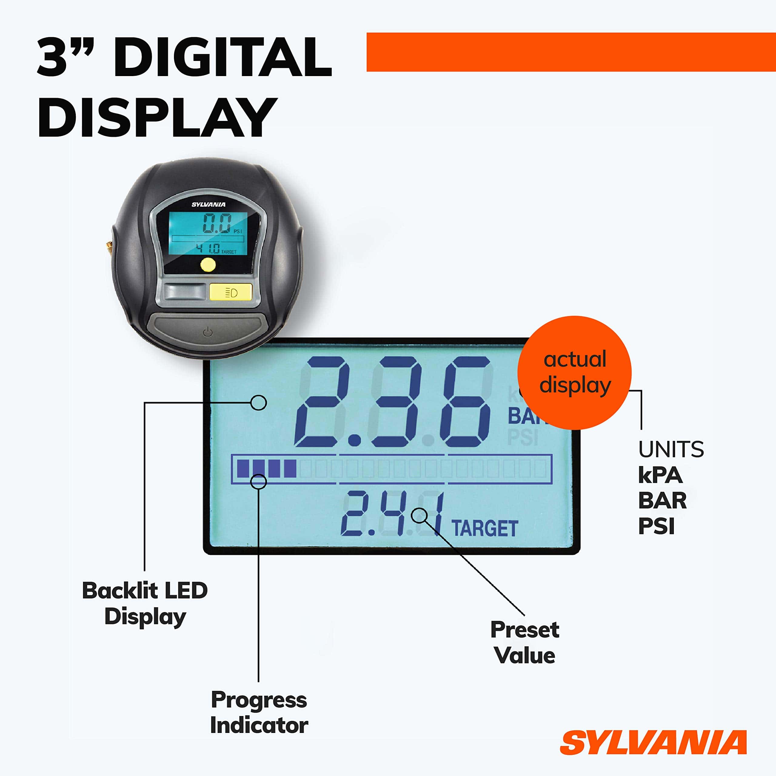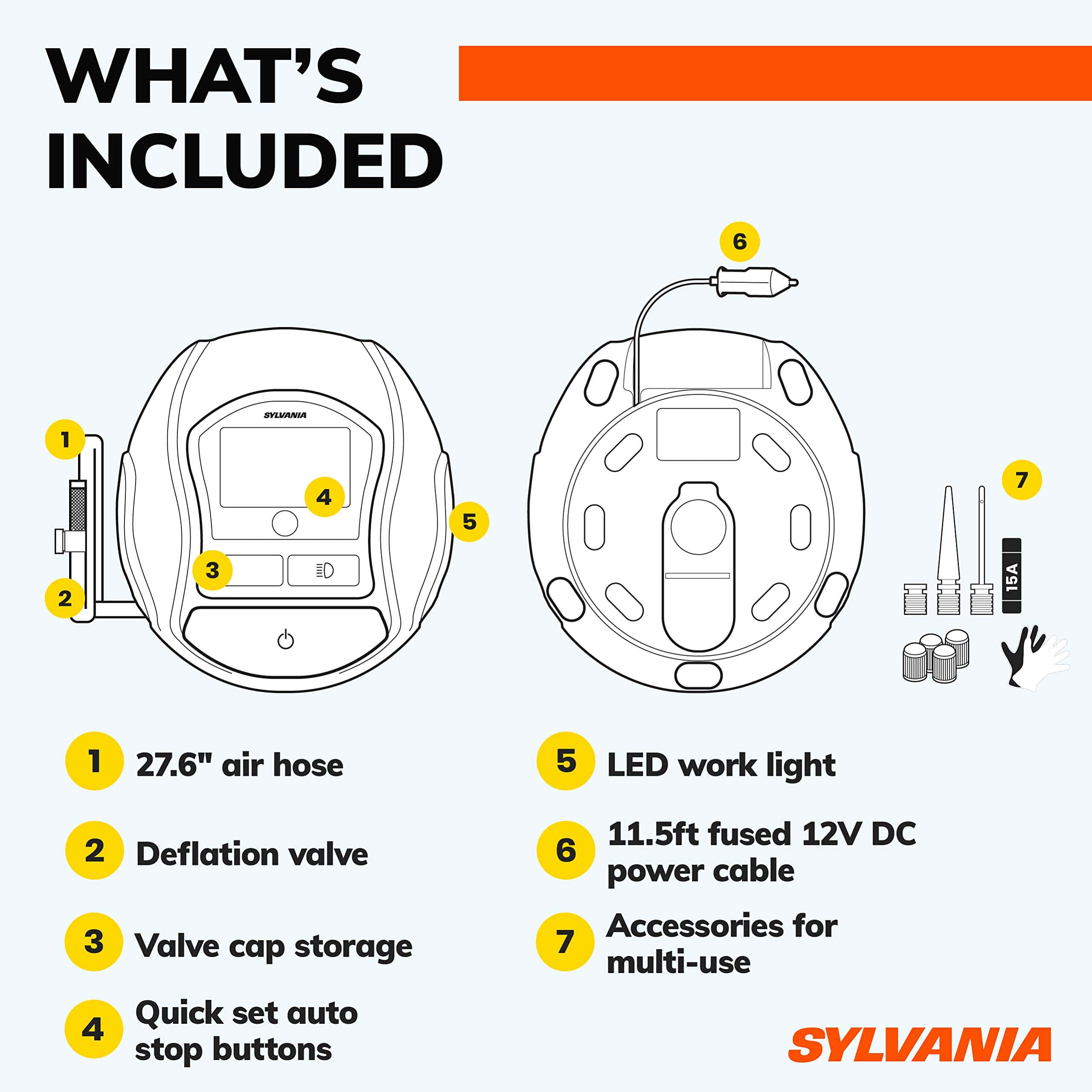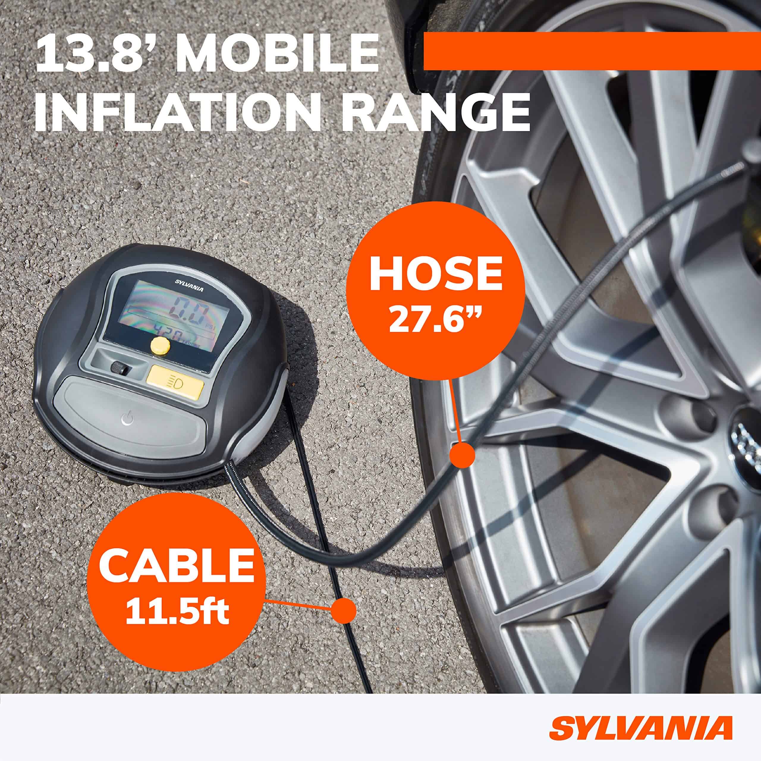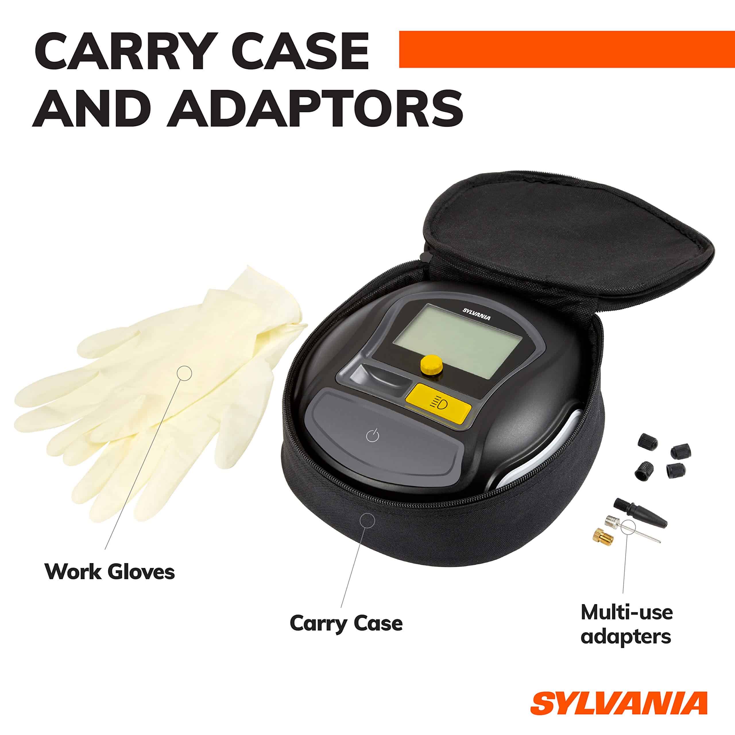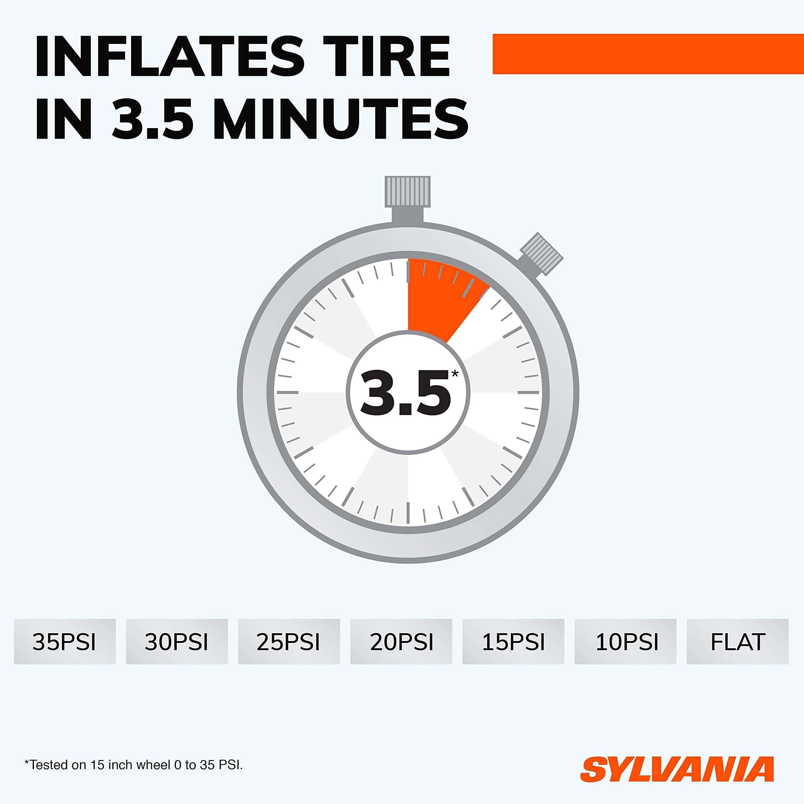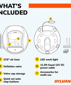 Prepárate para los viajes por carretera porque tener un neumático pinchado sucede en los momentos más inconvenientes. Los infladores de neumáticos portátiles de Sylvania Automotive pueden ayudar a mejorar tu economía de combustible y mantener fácilmente tus neumáticos sin ensuciarte los dedos. No solo para autos, también son una forma sencilla de inflar pelotas deportivas, neumáticos de bicicleta, colchones de aire, flotadores de piscina y más. El inflador de neumáticos portátil Sylvania Rapid es compacto y solo pesa 2.36 libras. Ofrece su tiempo de inflado más rápido para que vuelvas a la carretera y vuelvas a disfrutar de las actividades en familia. Tiene una luz de trabajo LED incorporada que te ayuda en la oscuridad a ver y ser visto por otros. Otras características incluyen memoria de punto de ajuste de presión objetivo para un uso repetido conveniente y una válvula deflactora incorporada en caso de que llenes demasiado accidentalmente. Agrega esto a tu kit de emergencia en carretera y ten la tranquilidad de que estás preparado. Los accesorios convenientes incluyen un estuche de transporte duradero con cremallera, 1 par de guantes de goma, 1 fusible de repuesto, 4 tapas de válvula de repuesto y 3 adaptadores con posición de almacenamiento en clip. Los adaptadores incluyen 1 aguja para pelotas deportivas, 1 adaptador de válvula presta para neumáticos de bicicleta especializados y 1 boquilla inflable negra universal para juguetes, balsas y colchones hinchables. Funciona con 12 voltios DC a 180 vatios y está protegido por un fusible reemplazable de 15 amperios en línea.
