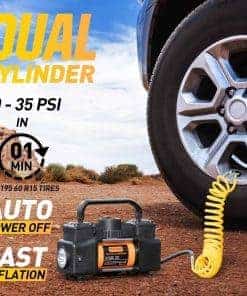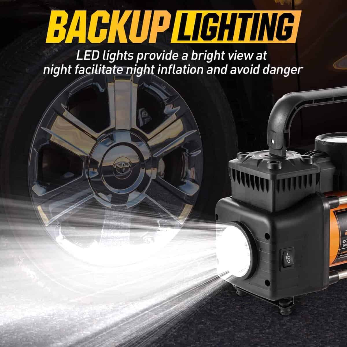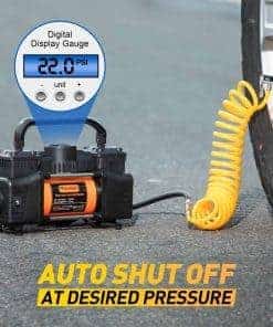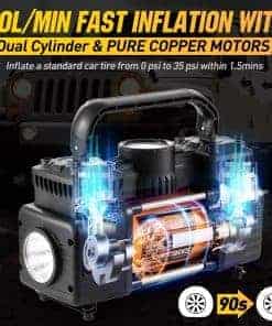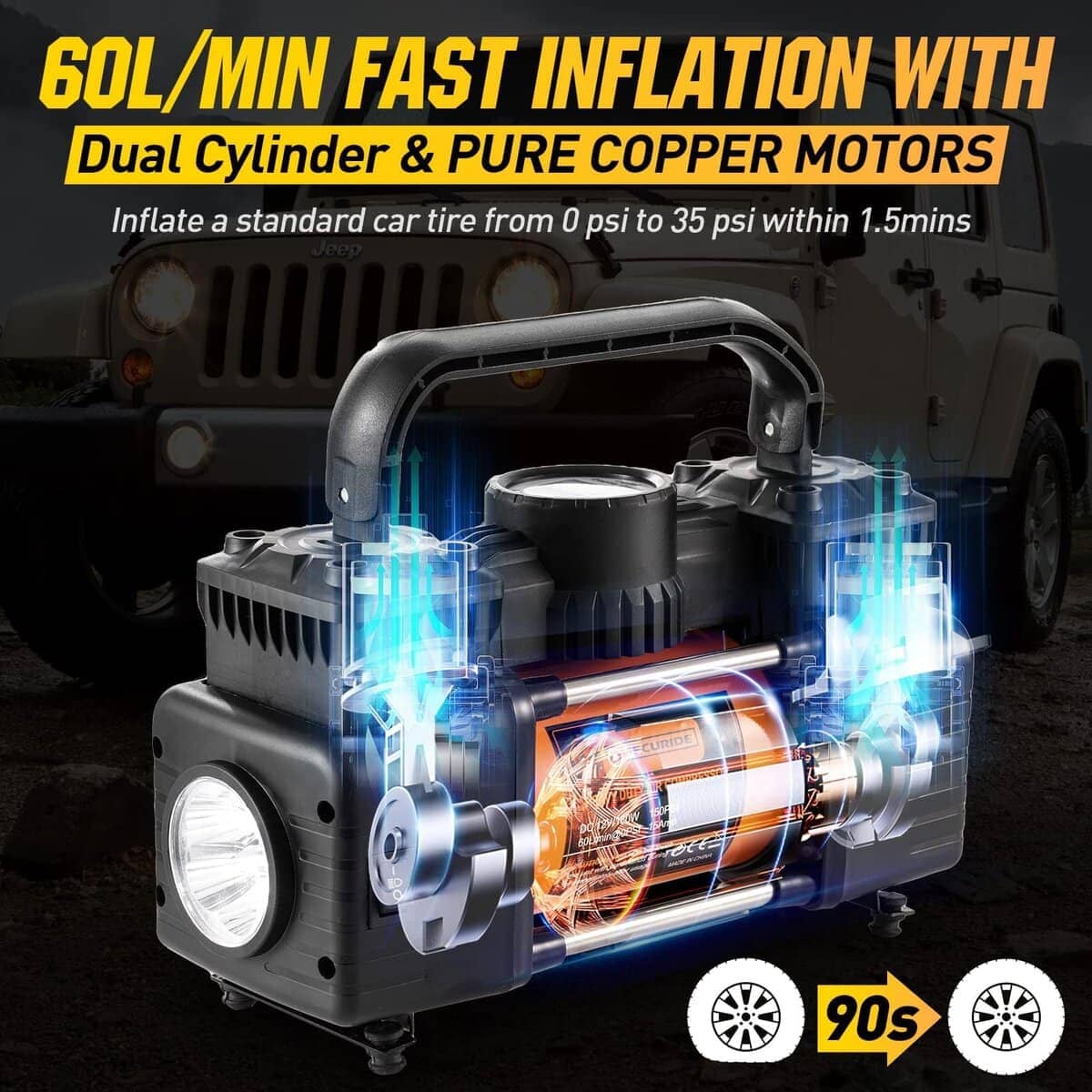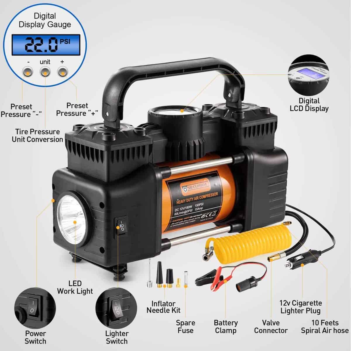 1. INFLADO RÁPIDO SECURIDE Diseño de doble cilindro de servicio pesado, presión máxima 150PSI, flujo de aire 60L/min, infla neumáticos normales de vehículos en 1,5 minutos (195/60/R15, 20-35psi). 2. LUZ LED BRILLANTE El compresor de aire portátil SECURIDE de 12v está equipado con luces LED brillantes y duraderas, permite una fácil operación o reparaciones rápidas en la oscuridad y asegura que pueda ser visto en una emergencia para evitar cualquier peligro potencial. 3. FUNCIONA especialmente adecuado para SUVs, camiones, furgonetas, RVs, crossovers, MPVs, campistas, remolques, minivans, también se puede usar para autos, motocicletas, carros de golf, bicicletas y más, o colchón de aire, este inflador de neumáticos portátil con medidor viene con varios adaptadores para que coincida con su boquilla. Simplemente conéctelo a la batería de su automóvil o al encendedor de cigarrillos del automóvil para ponerlo en marcha. 4. Diseño multifuncional La bomba de neumáticos de doble cilindro de servicio pesado SECURIDE está equipada con un indicador digital de presión de neumáticos con un margen de error inferior al 1%. La pantalla digital se puede cambiar entre 4 unidades de presión diferentes. El producto viene equipado con un protector contra sobrecargas incorporado, además de un sistema de apagado automático completo una vez que se alcanza la presión deseada. Los pies de goma en la parte inferior reducen eficazmente el ruido y la vibración. 5. ¿Qué hay en la caja? El paquete incluye Inflador de neumáticos de servicio pesado 1, Bolsa portátil 1, Cable de alimentación con clip de batería 1, Manguera de aire de espiral de 10 pies 1, Fusible reemplazable 1, Conos de boquilla de aire 2, Adaptador de válvula de aguja 1, Manual de usuario 1