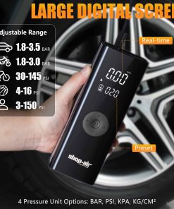 Este inflador de neumáticos tiene 5 modos de inflado preestablecidos (Auto, Moto, Bicicleta, Pelota y Manual) disponibles para diferentes aplicaciones. La bomba de aire para neumáticos de coche cuenta con una gran pantalla digital LCD con 4 unidades de medición de presión (PSI, KPA, BAR, KG/CM), lo que proporciona lecturas de presión en tiempo real.