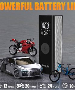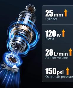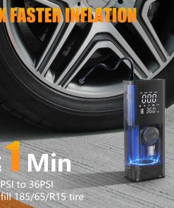 Con una capacidad de 150 PSI, este compresor de aire portátil está equipado con un motor de alta velocidad de 120W y una potente bomba de aire de 25 cilindros. Proporciona un flujo de inflado rápido de 28L/Min, el doble de la velocidad de otros infladores de neumáticos. Es posible un llenado rápido de 1 minuto de 25psi a 36psi (185/65/r15) neumáticos o una inflación completa de 5 minutos de neumáticos de coche 175/70 R14.