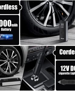 Inflador de neumáticos portátil SHOP�AIR, compresor de aire inalámbrico con una batería de 6000mAh y alimentación dual de 12v Dc. Este inflador de neumáticos para coche le permite cambiar entre modos inalámbrico y de alimentación. Viene con un cable de alimentación de 12V DC de 9.8 pies para que pueda alimentar la bomba directamente desde el enchufe del encendedor de su coche, lo que lo hace perfecto para su uso sobre la marcha.