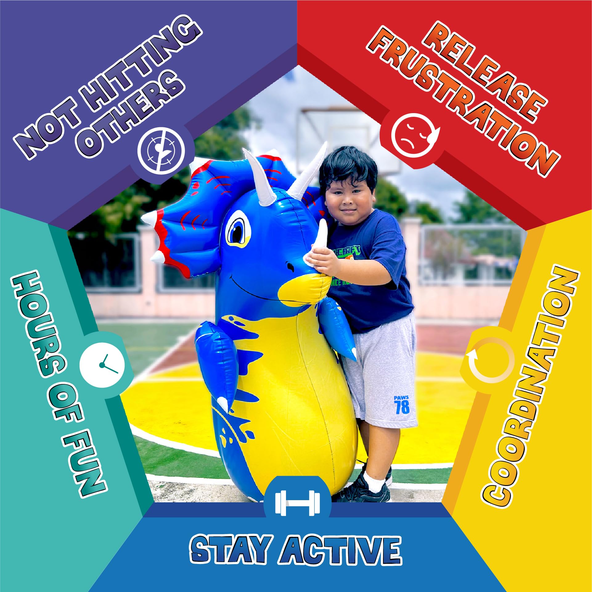 Bolsa de Boxeo de Dinosaurio Nuestra bolsa de boxeo inflable para niños es un gran juguete para tener! -Aumenta la actividad física de tu hijo y mejora su salud. -Tiene la opción de jugar en interiores y exteriores. -Ayuda a controlar las emociones (Libera estrés y frustración mientras aumenta el ánimo) -¡Celebra logros, disfruta de las vacaciones y diviértete en fiestas de cumpleaños! ¡Nuestra bolsa de boxeo también es un increíble juguete deportivo para niños que se puede usar para combates, karate, MMA, kickboxing, taekwondo y más! Edad mínima recomendada 3+