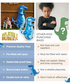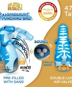 Saco de boxeo de dinosaurio de 47 pulgadas de altura y 7.82 libras de peso. Hecho con pvc de alta calidad, aprobado oficialmente para la seguridad de los niños, resistente a las fugas, al calor y al frío, y altamente duradero. Este saco de boxeo inflable es ideal para golpear tanto en interiores como en exteriores. Puede ser utilizado para juegos de fiesta, entrenamiento activo o como decoración en una fiesta de cumpleaños. Viene con 3 bolas blancas en su interior y está prellenado con arena en la base para mayor estabilidad y durabilidad. Perfecto regalo para niños que les mantendrá entretenidos por horas.