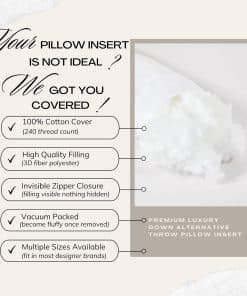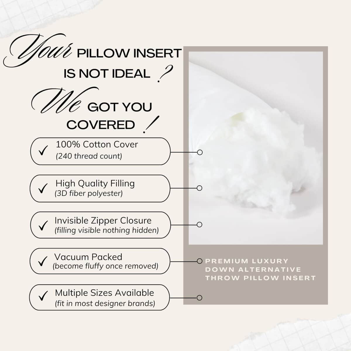 2. Tamaño Asegúrese que la almohada esté completamente llena y luzca exuberantemente regordete, se recomienda un inserto 1-2″ más grande que la funda para un aspecto estético. Por favor permita medio pulgada de desviación debido al corte y costura a mano.