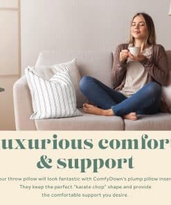 Inserto de almohada decorativa ComfyDown, relleno de plumas y plumón, con cubierta de algodón 100% de 233 hilos. Perfecto para dar un toque elegante a sus almohadas decorativas. Este inserto está expertamente lleno con 95% plumas y 5% plumón, y cubierto con una tela de alta calidad para garantizar comodidad y suavidad. Las costuras a prueba de plumas evitan que las plumas sobresalgan y mantienen el relleno en su lugar. Fabricado en Estados Unidos, este producto de calidad es una excelente adición para cualquier colección de artículos para el hogar. Recomendamos medir correctamente el tamaño de su funda de almohada para encontrar el inserto adecuado. Además, es importante seguir las instrucciones de uso y cuidado para asegurarse de que su almohada se mantenga esponjosa y cómoda durante mucho tiempo.