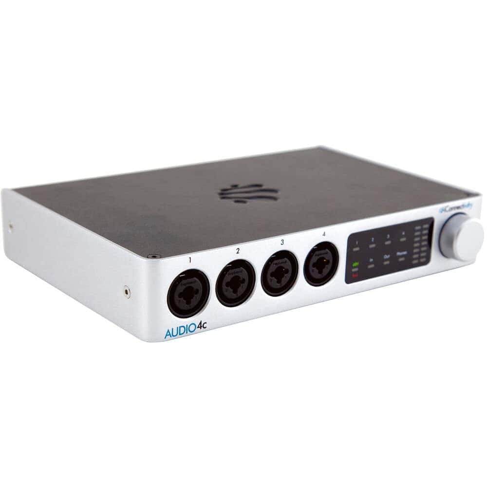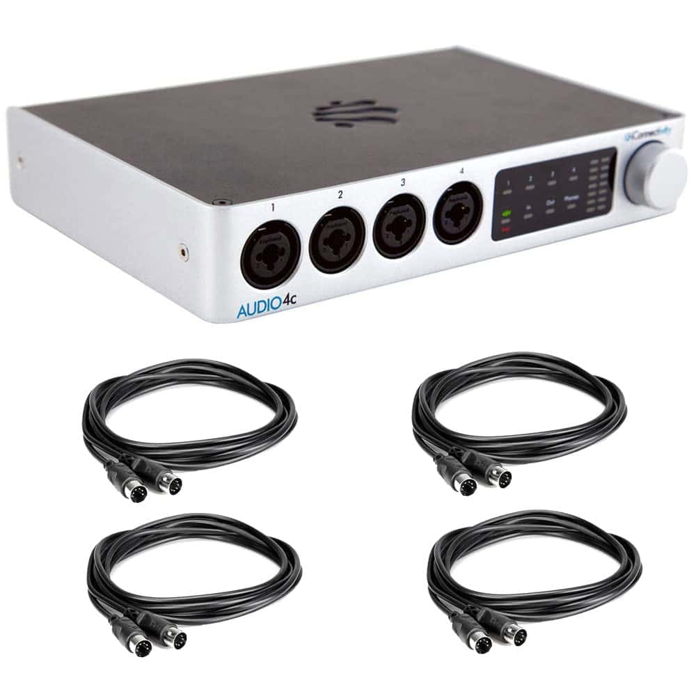 Interfaz de audio/MIDI USB Tipo-C de escritorio iConnectivity AUDIO4c Cable USB Tipo-C Adaptador de USB Tipo-C a USB Tipo-A Fuente de alimentación de 12V con centro positivo Ableton Live Lite (Descarga) Garantía limitada de 1 año 4x Cable MIDI negro de 10 pies
