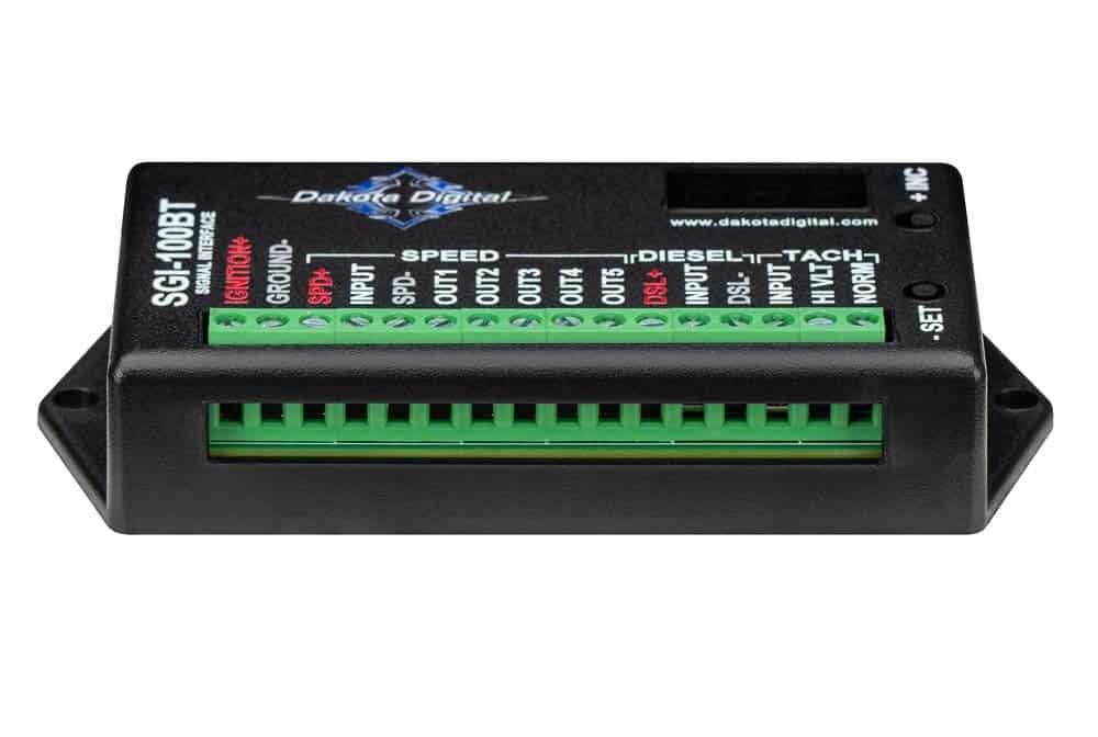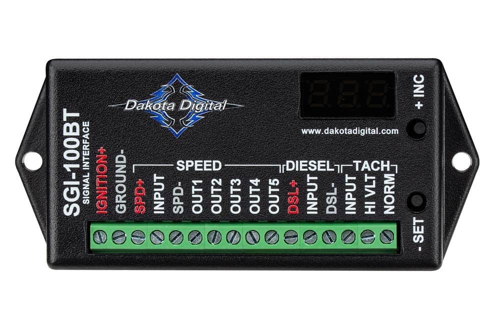 La funcionalidad de tres dispositivos en una caja de 4 x 2 x 1 pulgadas! El SGI-100BT puede ajustar/dividir/recalibrar una señal de velocidad electrónica, calibrar una señal de tacómetro y ayudar en la creación y ajuste de una señal de tacómetro de gas para aplicaciones de intercambio de diésel! Calibración de velocidad del 25% al 400%. Múltiples salidas de velocidad disponibles para múltiples dispositivos. Pull-u electrónico incorporado; entrada de voltaje alto o bajo. Configuraciones de tacómetro de 1-16 cilindros y tipo de señal de 5V o 12V. Aplicaciones de diésel: salidas para 4, 6 u 8 tacómetros de cilindros. Puede leer del sensor de volante (disponible por separado), sensor de engranaje de sincronización o terminal W del alternador (toma de estator). La tecnología Bluetooth sincroniza la unidad con la aplicación móvil disponible para programación y configuración. Botones de programación incorporados y pantalla LED para configuración en lugar de la aplicación. No apto para su uso con sensores o sistemas ABS. Producto no compatible con la mayoría de los tacómetros europeos actuales del ’86 en adelante o los jeeps actuales del ’96 en adelante.