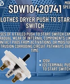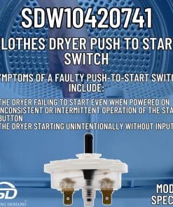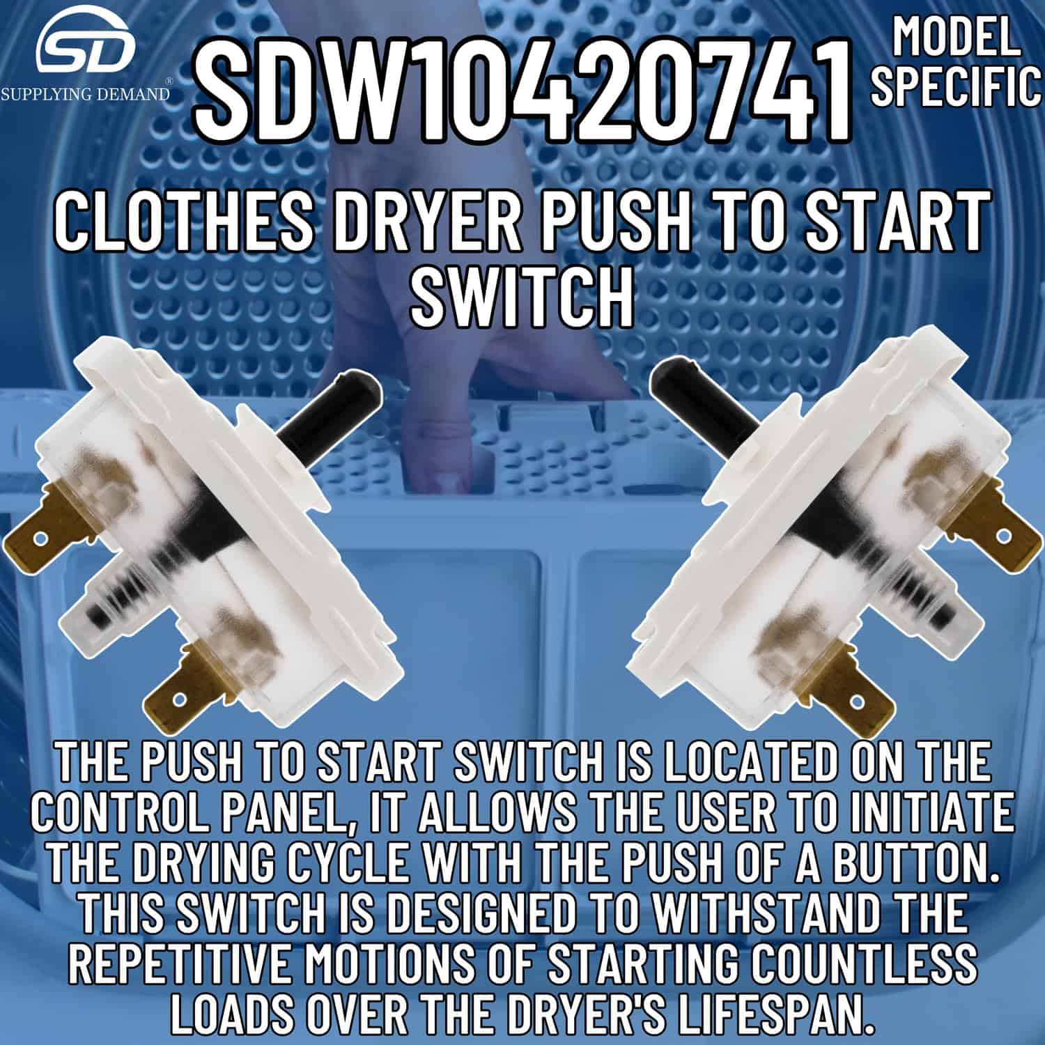 1. Los números de parte alternativos incluyen WPW10420741, AP6021228 y PS11754549. 2. 120V | Interruptor PTS de 2 terminales | Inicia la secadora cuando presiona y suelta el botón | Se ajusta a secadoras y centros de lavandería específicos para modelos. 3. Es importante desconectar su electrodoméstico de la alimentación eléctrica y de gas antes de realizar el servicio. 4. Las piezas de repuesto de Supplying Demand son compatibles con las principales marcas, pero siempre debe verificar el ajuste con su modelo específico. Hemos incluido un video en la galería del producto para ayudarlo a encontrar su número de modelo e información en la descripción a continuación. 5. Los productos de SD vienen en un paquete de Supplying Demand.
