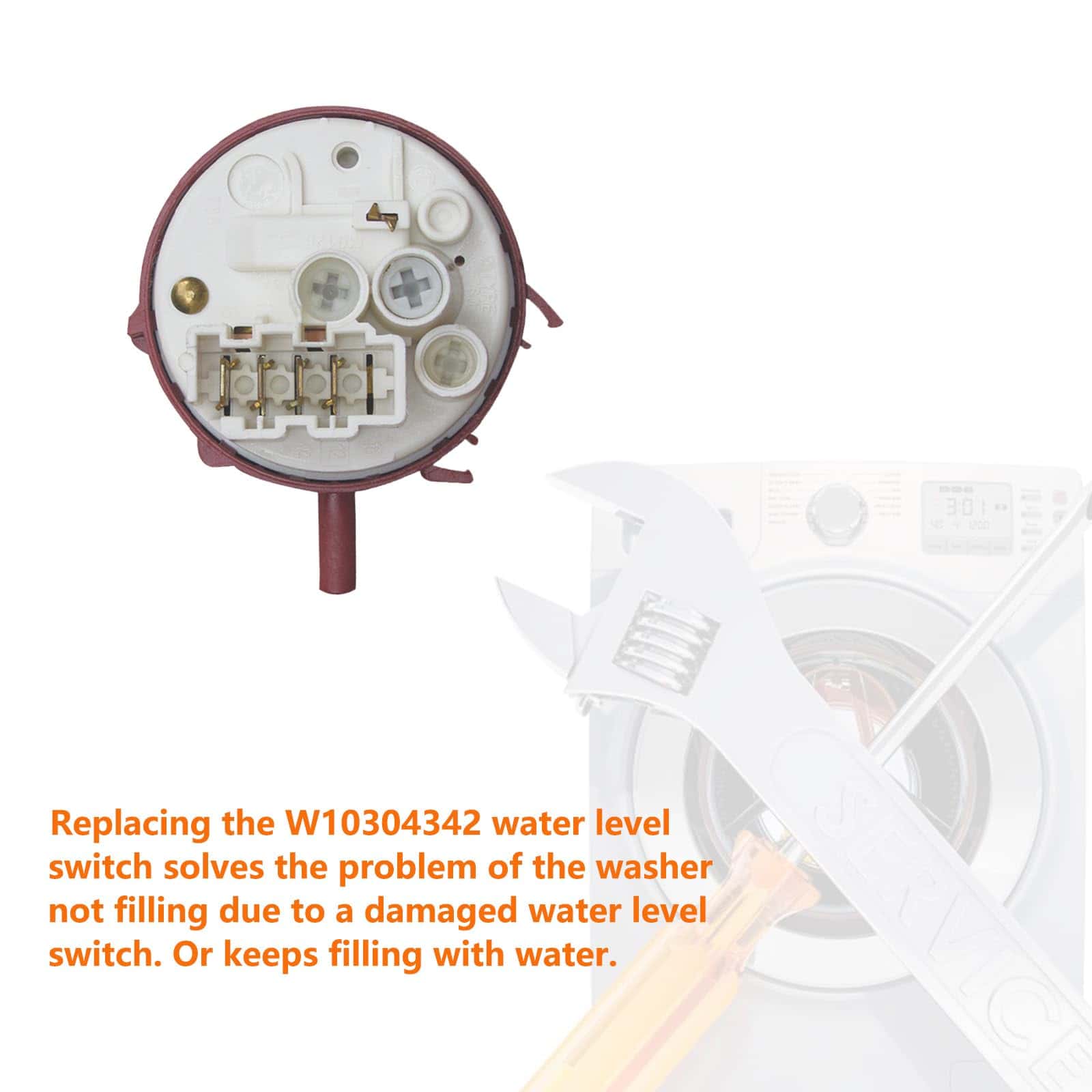 3. Reemplazar el interruptor de nivel de agua W10304342 resuelve el problema de la lavadora que no se llena debido a un interruptor de nivel de agua dañado. O sigue llenándose de agua.