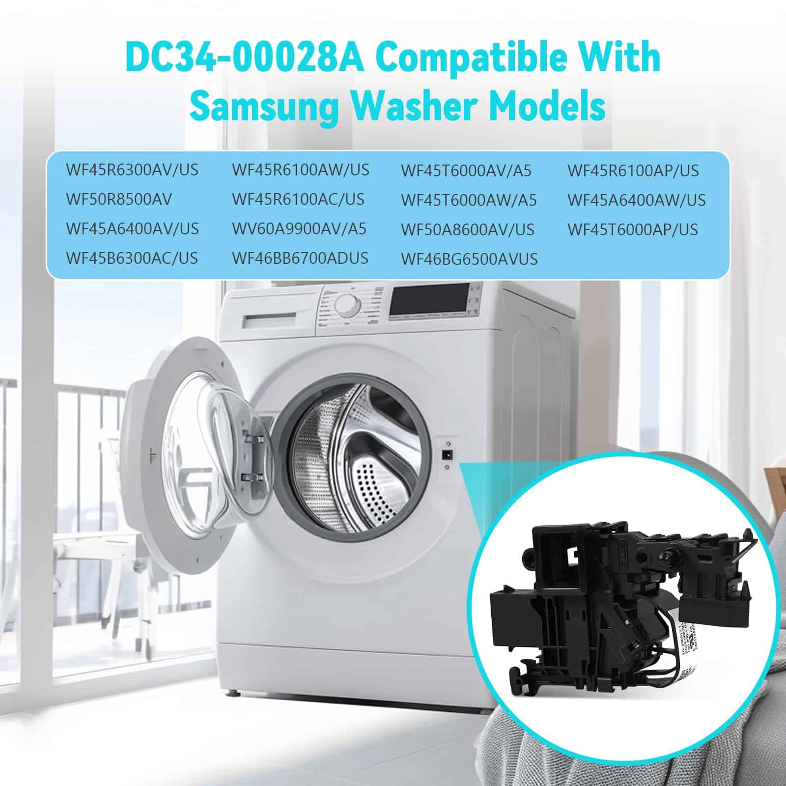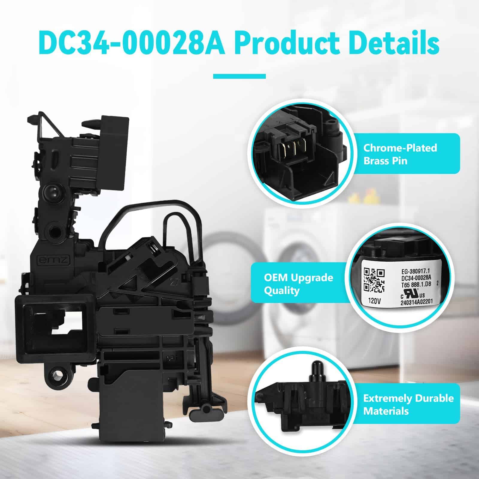 3. Piezas de Repuesto — El ensamblaje de interruptor de puerta de bloqueo de lavadora o secadora DC34-00028A puede reemplazar piezas de estos modelos: EG-380917.1, T65888.1.D8, 4975290, AP6975226, PS12740237, EAP12740237, etc.