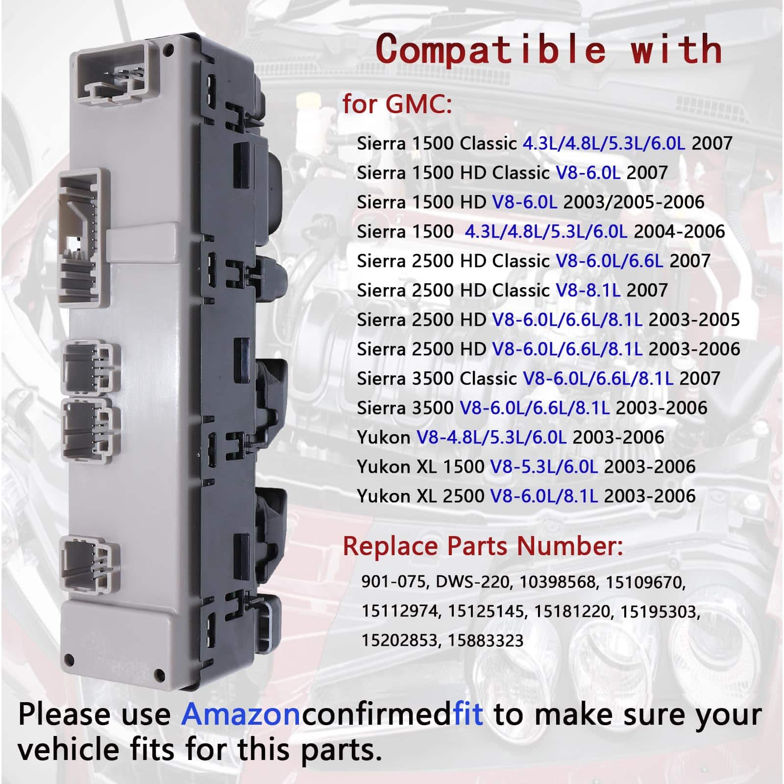 Lista de paquetes: 1pcs ensamblaje de control de la ventana de la energía del conductor de la izquierda delantera Terminal: 4+26+10+12+10 Pines Compatible con los siguientes modelos: para Cadillac: Escalade 2003-2006 Escalade ESV V8-6.0L 2003-2006 Escalade EXT V8-6.0L 2003-2006 para Chevrolet: Avalanche 1500 V8-5.3L 2003-2006 Avalanche 2500 V8-8.1L 2003-2006 Silverado 1500 Classic 4.3L/4.8L/5.3L/6.0L 2007 Silverado 1500 HD Classic V8-6.0L 2007 Silverado 1500 HD V8-6.0L 2003/2005-2006 Silverado 1500 4.3L/4.8L/5.3L/6.0L 2004-2006 Silverado 2500 HD Classic V8-6.0L/6.6L/8.1L 2007 Silverado 2500 HD V8-6.0L/6.6L/8.1L 2003-2006 Silverado 2500 V8-6.0L 2004 Silverado 3500 Classic V8-6.0L/6.6L/8.1L 2007 Silverado 3500 V8-6.0L/6.6L/8.1L 2003-2006 Suburban 1500 V8-5.3L/6.0L 2003-2006 Suburban 2500 V8-6.0L/8.1L 2003-2006 Tahoe V8-4.8L/5.3L 2003-2006 para GMC: Sierra 1500 Classic 4.3L/4.8L/5.3L/6.0L 2007 Sierra 1500 HD Classic V8-6.0L 2007 Sierra 1500 HD V8-6.0L 2003/2005-2006 Sierra 1500 4.3L/4.8L/5.3L/6.0L 2004-2006 Sierra 2500 HD Classic V8-6.0L/6.6L/8.1L 2007 Sierra 2500 HD V8-6.0L/6.6L/8.1L 2003-2005 Sierra 2500 HD V8-6.0L/6.6L/8.1L 2003-2006 Sierra 3500 Classic V8-6.0L/6.6L/8.1L 2007 Sierra 3500 V8-6.0L/6.6L/8.1L 2003-2006 Yukon V8-4.8L/5.3L/6.0L 2003-2006 Yukon XL 1500 V8-5.3L/6.0L 2003-2006 Yukon XL 2500 V8-6.0L/8.1L 2003-2006 Por favor, verifique dos veces la forma y el modelo de sus piezas originales antes de comprar, y compárelos con nuestra imagen para evitar la compra incorrecta. O proporcione su VIN y la información detallada del modelo de automóvil, y lo confirmaremos por usted.