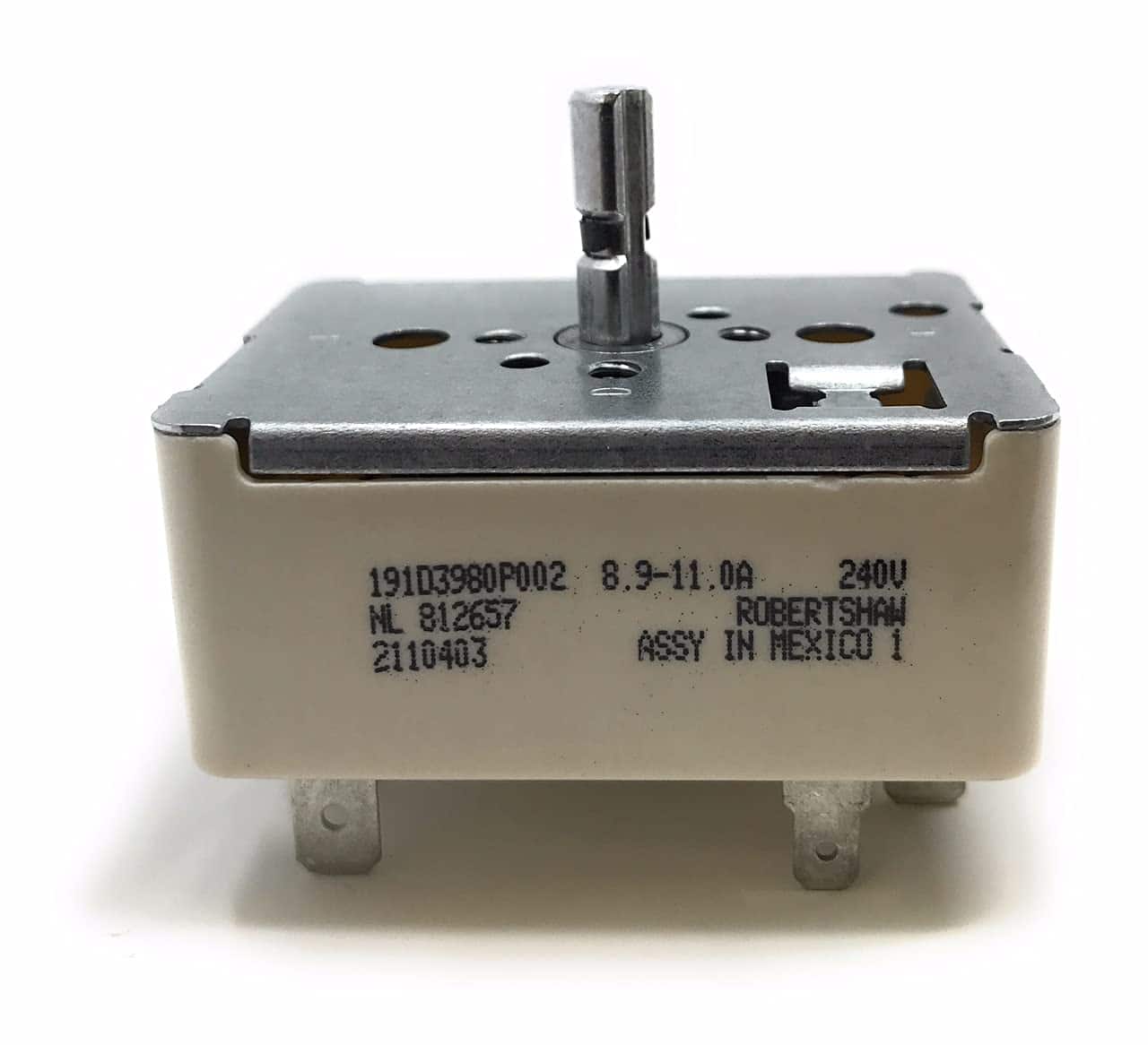 1. Interruptor OEM para estufa WB23K10003, 812657, 191D3980P002, 8.9~11.0 AMP, 240 Voltios; para encender/apagar el quemador de 8″. Si necesitas un interruptor para el quemador de 6″, necesitarás el WB23K10002 en su lugar.