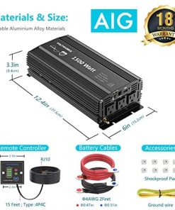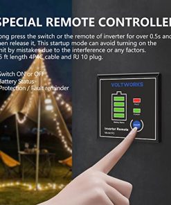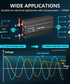 VOLTWORKS, MEJORE SU VIDA VOLTWORKS está dedicado a resolver sus problemas de energía en exteriores y emergencias con un inversor de alta calidad. Es ideal para camiones, RV en viajes por carretera o en caso de cortes de energía, alimenta sus dispositivos en casa o al aire libre para emergencias, huracanes, tormentas, apagones. ESPECIFICACIONES: Potencia: 1500 vatios de potencia nominal Forma de Onda de Salida: Onda Sinusoidal Pura Voltaje de Entrada: 9.5-16VCC Voltaje de Salida: 120VCA ± 10% Eficiencia: hasta 90% Control Remoto con cables de 15 pies Ventilador de refrigeración inteligente incorporado: se activará automáticamente cuando la temperatura alcance los 104 grados Fahrenheit o la potencia de carga supere los 1000W. Protección contra sobrecalentamiento: alrededor de 149 grados Fahrenheit Apagado por sobretensión: 16V ± 0.5VCC Alarma de baja tensión: 9.8V ± 0.5VCC Apagado por baja tensión: 9.5V ± 0.5VCC ATENCIÓN: Conecte el inversor a una batería de 12V con los cables estándar provistos con el producto, y conecte sus dispositivos de CA al inversor. Por favor, no deje el inversor de corriente en posición ON cuando el automóvil esté apagado. Desconecte el terminal de batería positivo antes de realizar cualquier cableado en el inversor. No exponga el inversor directamente a la luz solar, manténgalo en un ambiente fresco y seco. No utilice el inversor con un producto que consuma más energía de la que el inversor puede proporcionar, ya que esto puede causar daños al inversor y al producto. LISTA DE PAQUETE: 1x Inversor de Corriente de 1500W 2x Cables de Batería (negro y rojo) 1x Control Remoto 1x Manual de Usuario GARANTÍA de 12 meses por VOLTWORKS