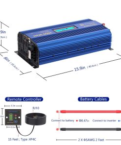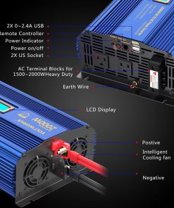 VOLTWORKS, MEJORANDO SU VIDA VOLTWORKS se dedica a resolver sus problemas de energía al aire libre y de emergencia con un inversor de alta calidad. Es ideal para camiones, RV en viajes por carretera o en caso de cortes de energía, alimente sus dispositivos en su hogar o al aire libre en caso de emergencia, huracán, tormenta, corte de energía. ESPECIFICACIONES: Potencia: 2000 vatios de potencia nominal, 4000 vatios de potencia pico Onda de Salida: Onda Modificada Voltaje de Entrada: 9.5-16VDC Voltaje de Salida: 120VAC 10% Eficiencia: hasta 90% Pantalla LCD: Muestra la capacidad restante de su batería y el voltaje de entrada/salida del inversor. Control Remoto con cables de 15 pies Ventilador de enfriamiento inteligente integrado: Funcionará automáticamente cuando la temperatura alcance los 104 grados o la potencia de carga sea superior al 40% de la potencia nominal. Protección contra sobrecalentamiento: Alrededor de 149 grados. Apagado por sobretensión: 16V 0.5VDC Alarma por subvoltaje: 9.8V 0.5VDC Apagado por subvoltaje: 9.5V 0.5VDC. ATENCIÓN: Conecte el inversor a una batería de 12V con los cables estándar provistos con el producto y conecte sus dispositivos de corriente alterna al inversor. Por favor, no deje el inversor de corriente en la posición ON mientras su automóvil está apagado. Desconecte el terminal positivo de la batería antes de realizar cualquier conexión al inversor. No coloque el inversor directamente al sol, manténgalo en un entorno fresco y seco. No use el inversor con un producto que consuma más potencia de la que el inversor puede proporcionar ya que esto puede causar daños al inversor y al producto. LISTA DE PAQUETES: 1x Inversor de Corriente de 2000 vatios 2x Cables para Batería (negro y rojo) 1x Control Remoto 1x Manual de Usuario
