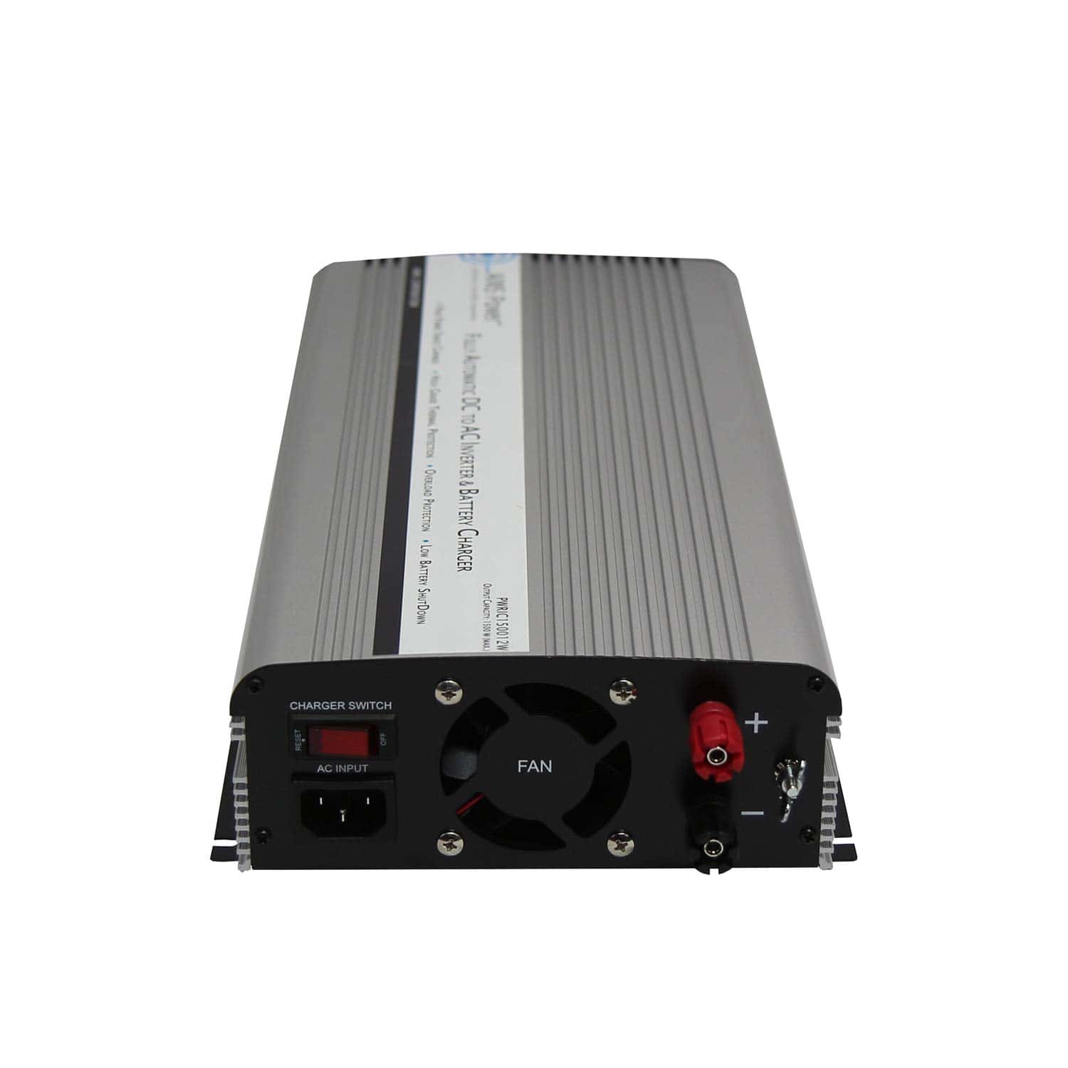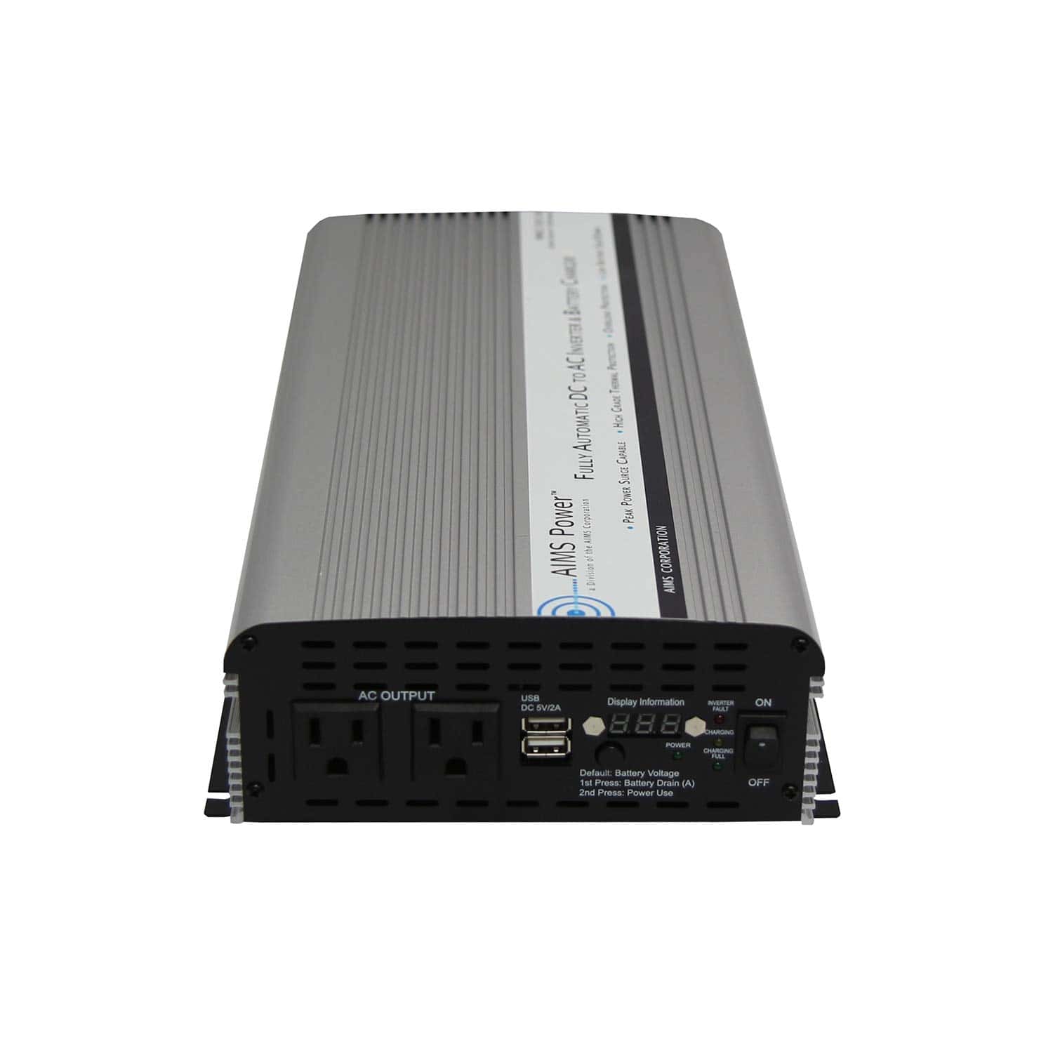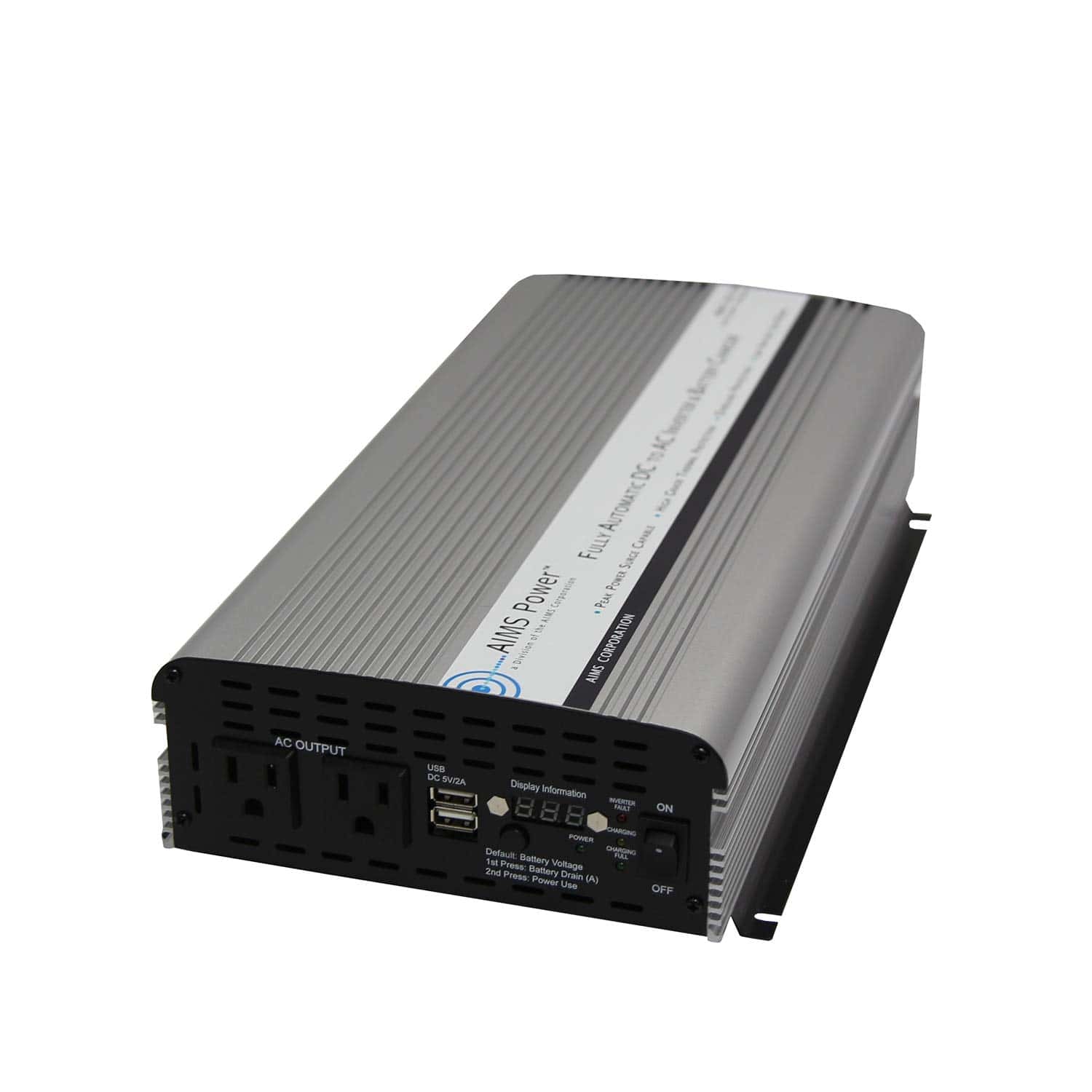 El inversor de corriente AIMS Power PWRIC1500W con cargador de batería e interruptor de transferencia, potencia máxima continua de 1500W, potencia pico en sobrecarga de 3000W, onda senoidal modificada, LED verde indica la entrada de corriente de CA, LED rojo indica la entrada de corriente de CA. La unidad es un inversor de potencia de 1500 vatios, con una entrada de cc de 12 voltios. Este inversor cargador tiene un interruptor de transferencia incorporado que le permite enchufar este inversor a una toma de corriente de CA regular en su hogar, cuando se corta la energía, este inversor de corriente cambia automáticamente para funcionar con la batería. Características clave: 1500W de potencia máx. continua, 3000W de pot. de pico en sobrecarga, onda senoidal modificada, LED verde indica la entrada de corriente de CA, interruptor de transferencia que cambia automáticamente cuando se pierde la energía de la ciudad, LED rojo indica la entrada de corriente de CA, Doble toma de corriente de CA, Protección contra sobrecalentamiento, Protección contra sobrecarga, Operación de un ventilador de enfriamiento, Cable de CA incluido para conectarse a la corriente de muelle, Protección interna por fusibles, Protección contra cortocircuitos de salida de CA, Caja de aluminio para enfriamiento óptimo, Placa de montaje pre-ranurada. Especificaciones: Voltaje de entrada/cc de funcionamiento: 10 a 15V, Voltaje de salida: 120V de CA, Frecuencia de salida: 60 Hz +/- 1 Hz, Alarma de voltaje bajo de la batería: 10,5 +/- 0,5V, Cierre de voltaje bajo de la batería: 10,0 +/- 0,5V, Eficiencia: 85-90%, Consumo sin carga: 0,6A, Amperios de CA: 13, Amperios de CD: 125, Protección contra voltaje de entrada alto: 15V, Cierre de voltaje de entrada bajo: 10V, Tamaño (LxAxP): 15.5″ x 7.75″ x 3.25″, Peso: 7 lbs