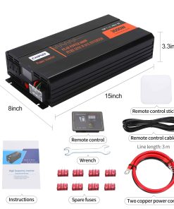 5. Instrucciones y Garantía – El paquete contiene el inversor y todos los accesorios necesarios. Revise la potencia del electrodoméstico y el método de instalación del inversor cuidadosamente antes de usarlo. El paquete incluye: 1 inversor de corriente, 1 control remoto, 8 fusibles de repuesto, 2 cables de alimentación de cobre, 1 cable de control remoto, 1 adhesivo de control remoto, 1 llave, 1 manual de usuario.