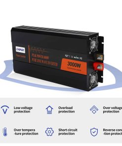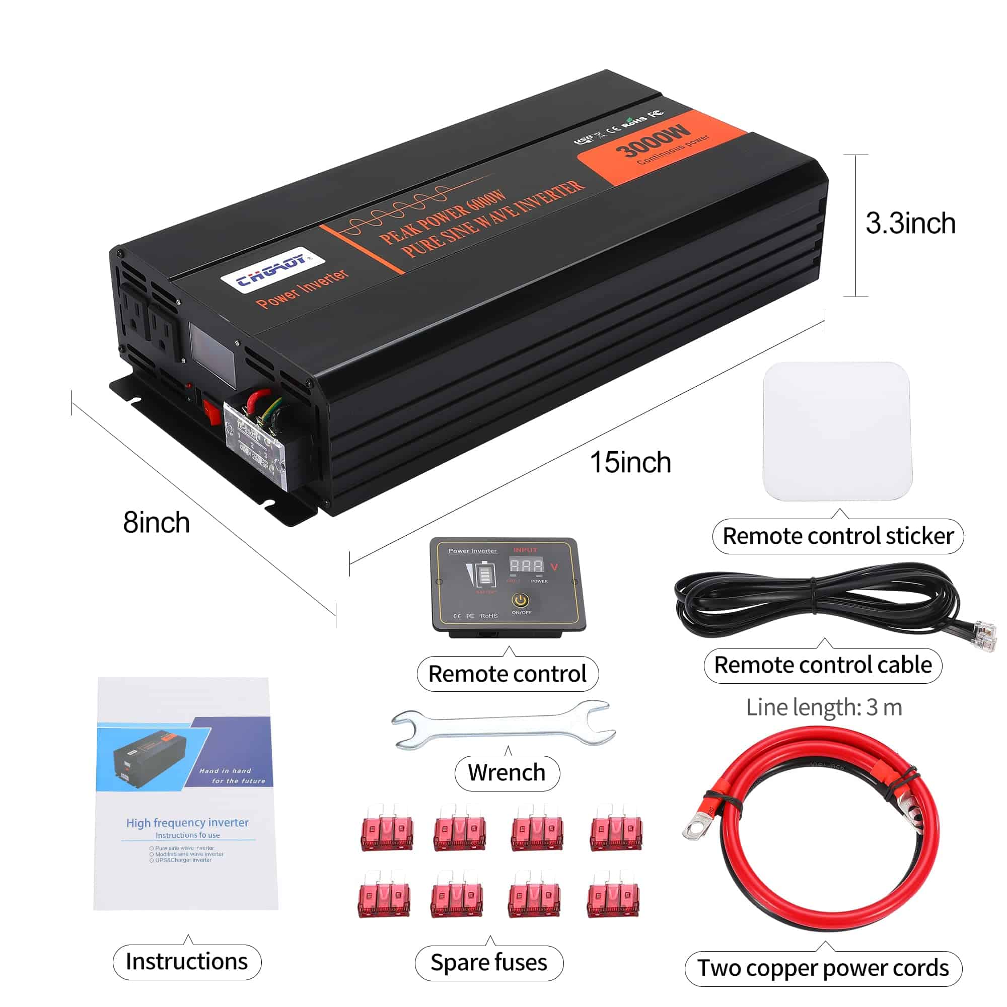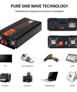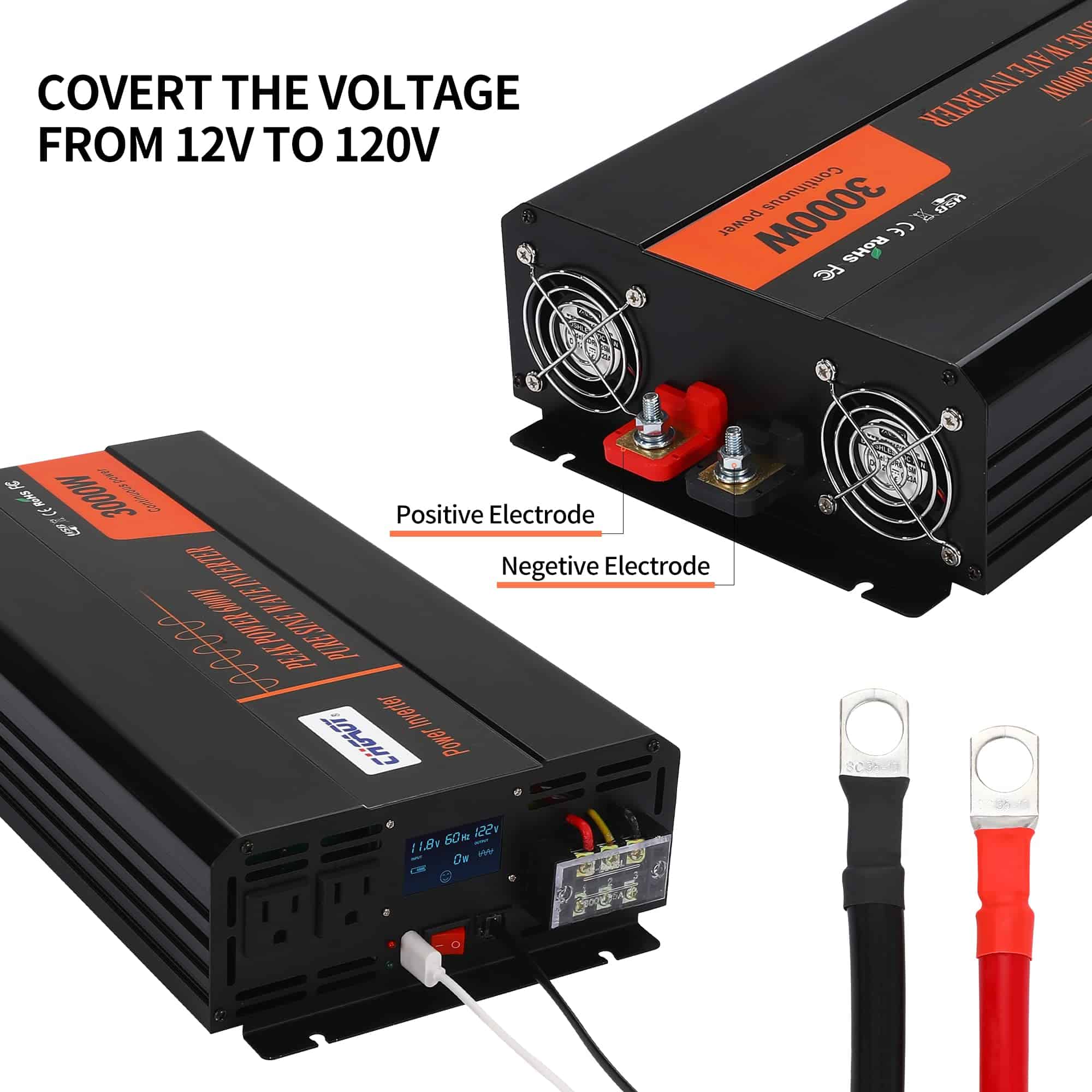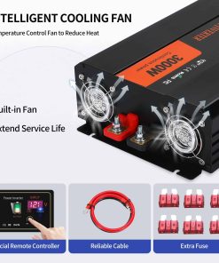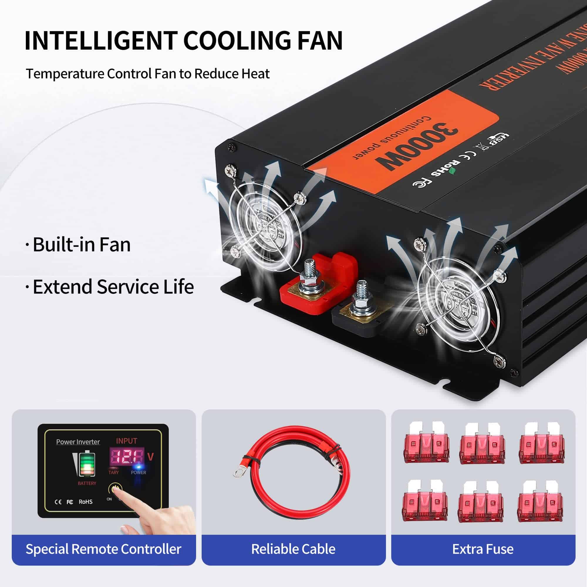 1. Inversor de Onda Sinusoidal Pura de 3000W – Inversor de alta calidad de onda sinusoidal pura, convierte la potencia de 12V DC de la batería a 120V AC, proporciona una potencia estable de 3000W, la potencia pico es de 6000W. El tipo de onda sinusoidal pura puede evitar desperdiciar energía durante la transmisión.