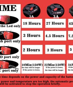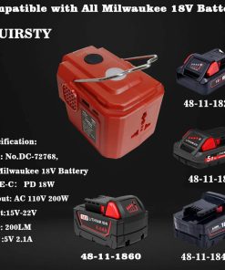1. Compatibilidad amplia Este convertidor de batería es compatible con todas las baterías de litio Max M18 18V 48-11-1820 48-11-1822 48-11-1840 48-11-1850 48-11-1852 48-11-1860 48-11-1862 y más. (Sin batería). 3. Ventaja 1.puedes cargar tu teléfono móvil, computadora, herramientas, ventilador, altavoz, etc. Puedes hacerlo en cualquier momento, en cualquier emergencia; 2. Fácil de llevar 3.Sistema de enfriamiento estable 4.200LM LED 5.Inversor con gancho 6. Seguro y confiable. 4. Inversor multifuncional Además del puerto de salida AC 110-120V; 1.Especificación, Artículo: No.DC-72768, para Milwaukee 18V Batería Inversor; 2. Salida: AC 110V 200W; 3.Tipo-C: PD 3.0/18W; 4.LED: 200LM; 5.Entrada: DC 18-22V 50/60Hz; 6.USB: 5V 2.1AH.